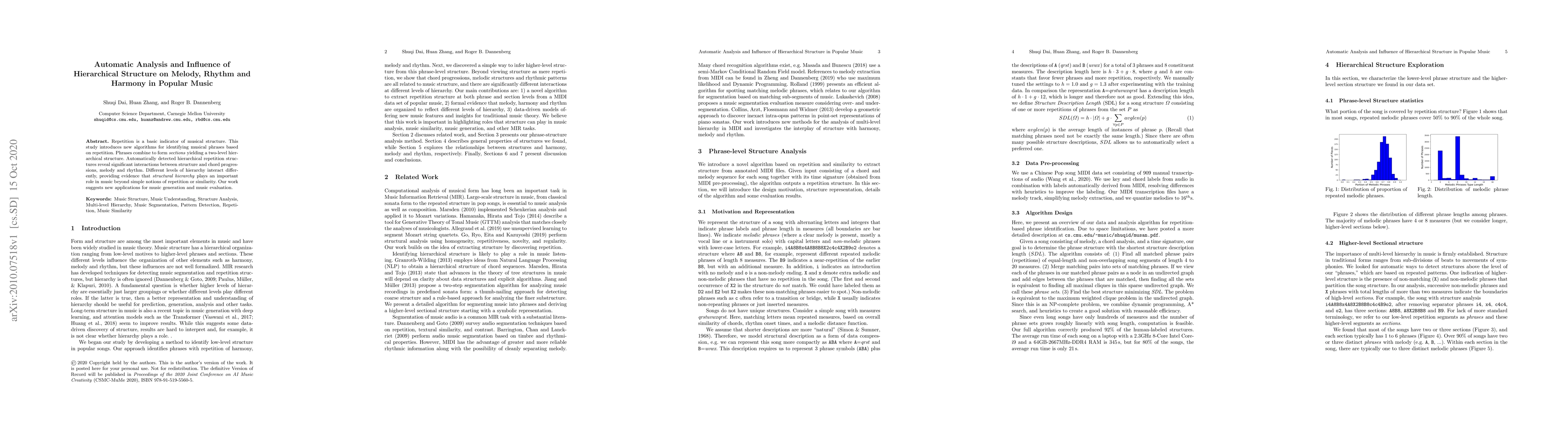 This study develops algorithms to identify and analyze hierarchical structures in popular music based on repetition, revealing significant interactions between melody, rhythm, and harmony. It demonstrates that different hierarchical levels influence music in complex ways, suggesting new avenues for music generation and evaluation.
