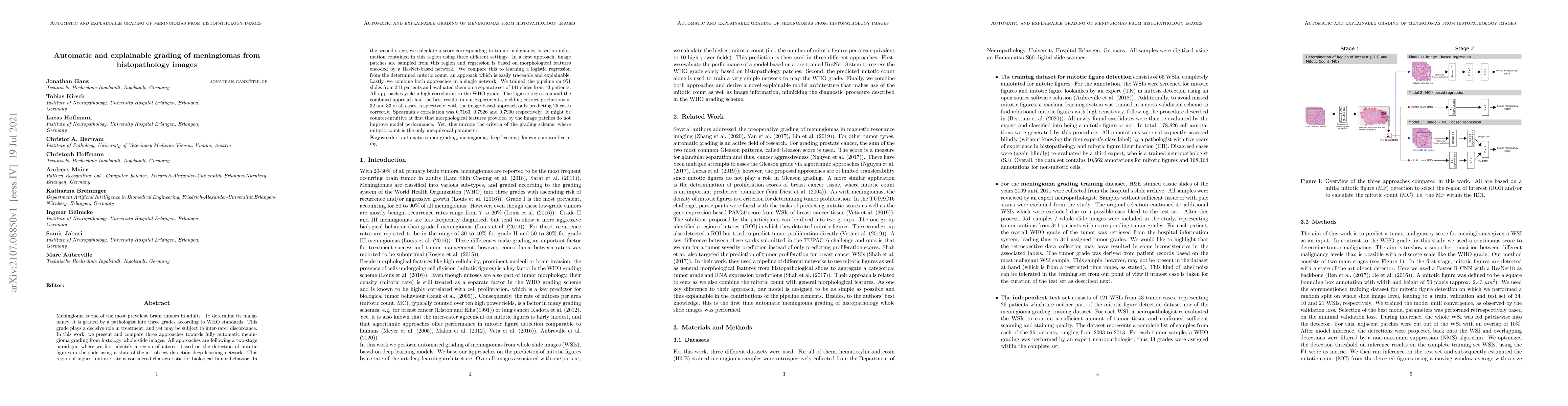 Meningioma is one of the most prevalent brain tumors in adults. To determine its malignancy, it is graded by a pathologist into three grades according to WHO standards. This grade plays a decisive role in treatment, and yet may be subject to inter-rater discordance. In this work, we present and compare three approaches towards fully automatic meningioma grading from histology whole slide images. All approaches are following a two-stage paradigm, where we first identify a region of interest based on the detection of mitotic figures in the slide using a state-of-the-art object detection deep learning network. This region of highest mitotic rate is considered characteristic for biological tumor behavior. In the second stage, we calculate a score corresponding to tumor malignancy based on information contained in this region using three different settings. In a first approach, image patches are sampled from this region and regression is based on morphological features encoded by a ResNet-based network. We compare this to learning a logistic regression from the determined mitotic count, an approach which is easily traceable and explainable. Lastly, we combine both approaches in a single network. We trained the pipeline on 951 slides from 341 patients and evaluated them on a separate set of 141 slides from 43 patients. All approaches yield a high correlation to the WHO grade. The logistic regression and the combined approach had the best results in our experiments, yielding correct predictions in 32 and 33 of all cases, respectively, with the image-based approach only predicting 25 cases correctly. Spearman's correlation was 0.716, 0.792 and 0.790 respectively. It may seem counterintuitive at first that morphological features provided by image patches do not improve model performance. Yet, this mirrors the criteria of the grading scheme, where mitotic count is the only unequivocal parameter.