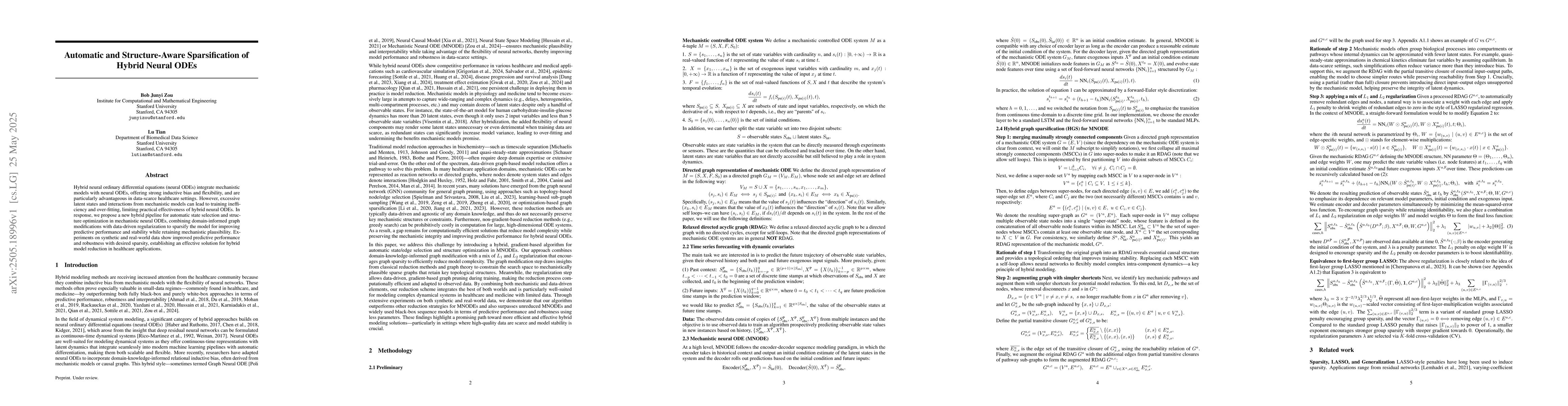 Hybrid neural ordinary differential equations (neural ODEs) integrate mechanistic models with neural ODEs, offering strong inductive bias and flexibility, and are particularly advantageous in data-scarce healthcare settings. However, excessive latent states and interactions from mechanistic models can lead to training inefficiency and over-fitting, limiting practical effectiveness of hybrid neural ODEs. In response, we propose a new hybrid pipeline for automatic state selection and structure optimization in mechanistic neural ODEs, combining domain-informed graph modifications with data-driven regularization to sparsify the model for improving predictive performance and stability while retaining mechanistic plausibility. Experiments on synthetic and real-world data show improved predictive performance and robustness with desired sparsity, establishing an effective solution for hybrid model reduction in healthcare applications.