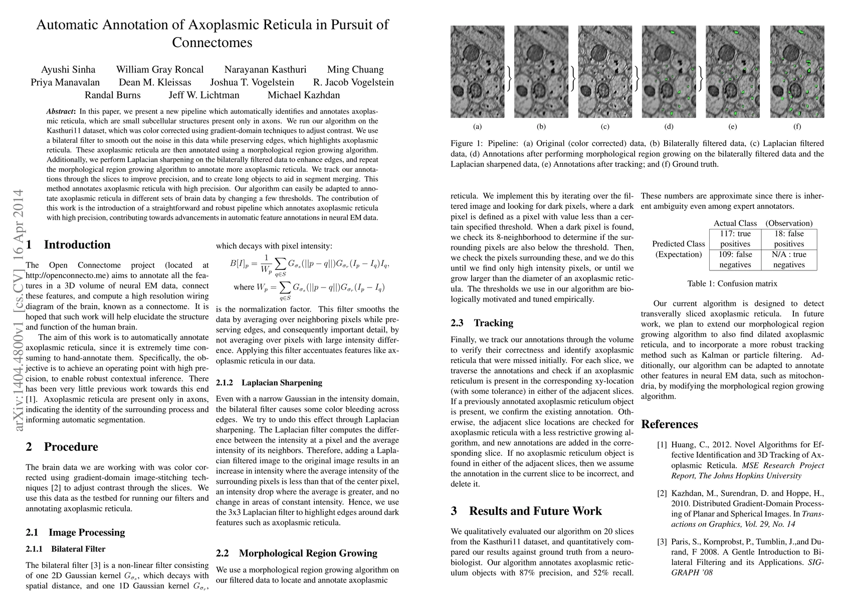In this paper, we present a new pipeline which automatically identifies and annotates axoplasmic reticula, which are small subcellular structures present only in axons. We run our algorithm on the Kasthuri11 dataset, which was color corrected using gradient-domain techniques to adjust contrast. We use a bilateral filter to smooth out the noise in this data while preserving edges, which highlights axoplasmic reticula. These axoplasmic reticula are then annotated using a morphological region growing algorithm. Additionally, we perform Laplacian sharpening on the bilaterally filtered data to enhance edges, and repeat the morphological region growing algorithm to annotate more axoplasmic reticula. We track our annotations through the slices to improve precision, and to create long objects to aid in segment merging. This method annotates axoplasmic reticula with high precision. Our algorithm can easily be adapted to annotate axoplasmic reticula in different sets of brain data by changing a few thresholds. The contribution of this work is the introduction of a straightforward and robust pipeline which annotates axoplasmic reticula with high precision, contributing towards advancements in automatic feature annotations in neural EM data.
