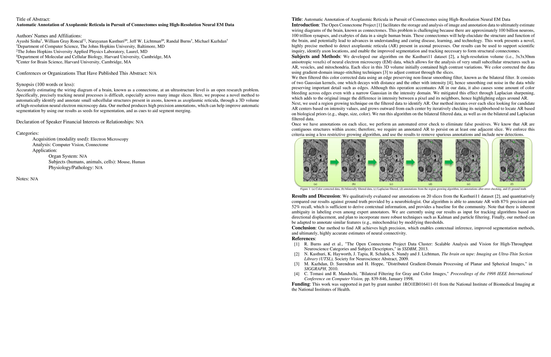 Accurately estimating the wiring diagram of a brain, known as a connectome, at an ultrastructure level is an open research problem. Specifically, precisely tracking neural processes is difficult, especially across many image slices. Here, we propose a novel method to automatically identify and annotate small subcellular structures present in axons, known as axoplasmic reticula, through a 3D volume of high-resolution neural electron microscopy data. Our method produces high precision annotations, which can help improve automatic segmentation by using our results as seeds for segmentation, and as cues to aid segment merging.