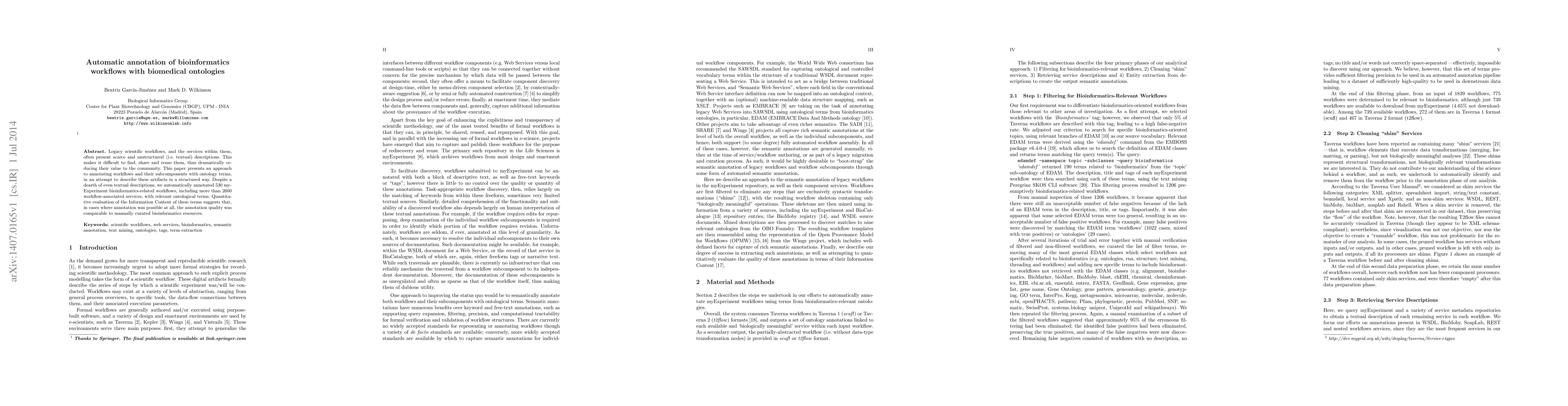 This paper introduces an automated method to annotate bioinformatics workflows and their services using biomedical ontologies, aiming to enhance their discoverability and reuse. The authors successfully annotated 530 myExperiment workflows and over 2600 associated services, demonstrating that the automatic annotations achieve comparable quality to manually curated resources.