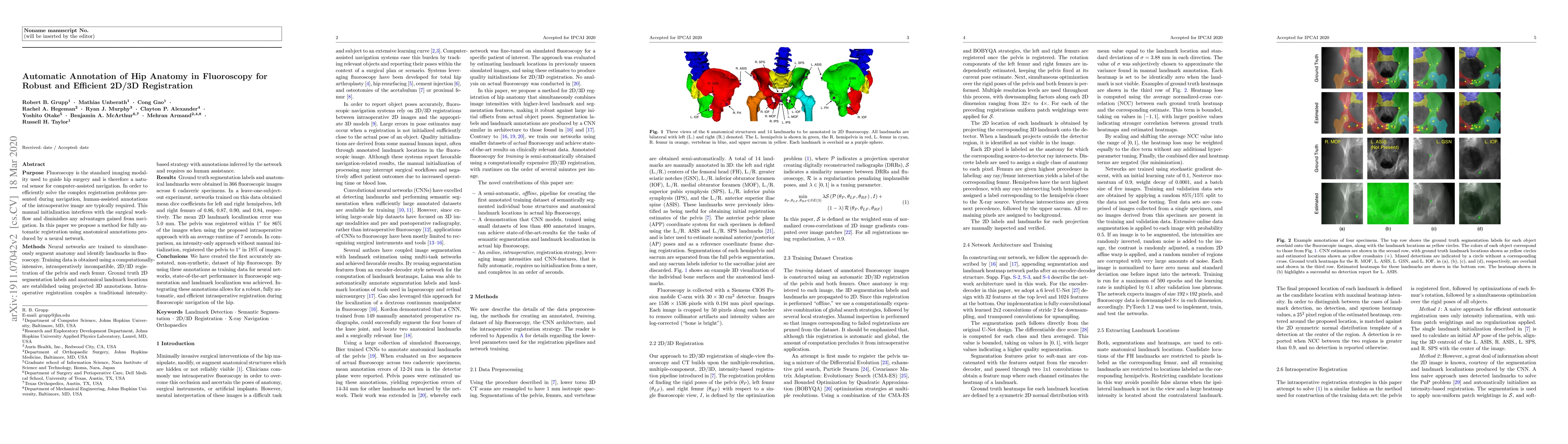 This paper proposes a fully automatic method for registering fluoroscopic images to 3D models during hip surgery using neural network annotations, achieving high accuracy in segmentation and landmark localization without manual intervention. The method significantly improves registration efficiency and accuracy compared to intensity-only methods.
