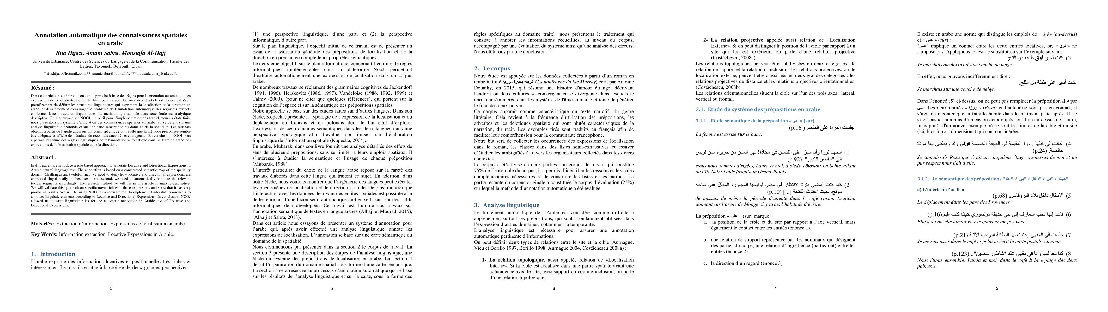 In this paper, we introduce a rule-based approach to annotate Locative and Directional Expressions in Arabic natural language text. The annotation is based on a constructed semantic map of the spatiality domain. Challenges are twofold: first, we need to study how locative and directional expressions are expressed linguistically in these texts; and second, we need to automatically annotate the relevant textual segments accordingly. The research method we will use in this article is analytic-descriptive. We will validate this approach on specific novel rich with these expressions and show that it has very promising results. We will be using NOOJ as a software tool to implement finite-state transducers to annotate linguistic elements according to Locative and Directional Expressions. In conclusion, NOOJ allowed us to write linguistic rules for the automatic annotation in Arabic text of Locative and Directional Expressions.