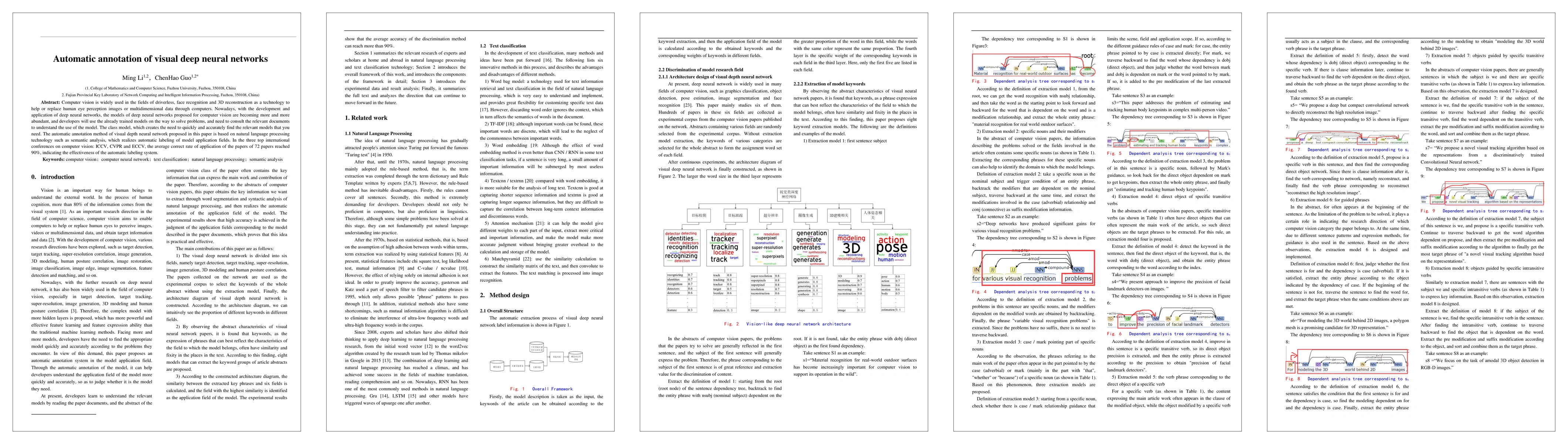 This paper proposes an automatic annotation method for visual deep neural networks using natural language processing and semantic analysis to label model application fields. The system achieved an average correct rate of 90% in classifying papers from top computer vision conferences, demonstrating its effectiveness.
