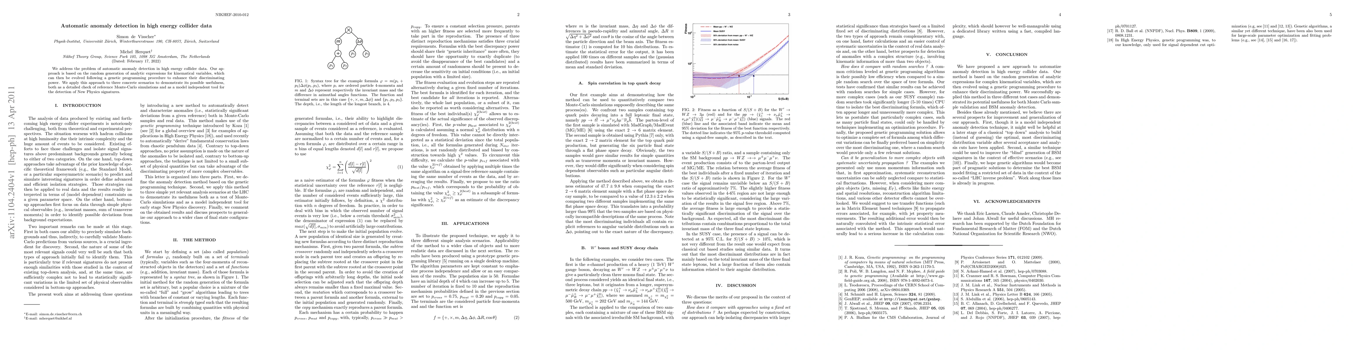 We address the problem of automatic anomaly detection in high energy collider data. Our approach is based on the random generation of analytic expressions for kinematical variables, which can then be evolved following a genetic programming procedure to enhance their discriminating power. We apply this approach to three concrete scenarios to demonstrate its possible usefulness, both as a detailed check of reference Monte-Carlo simulations and as a model independent tool for the detection of New Physics signatures.