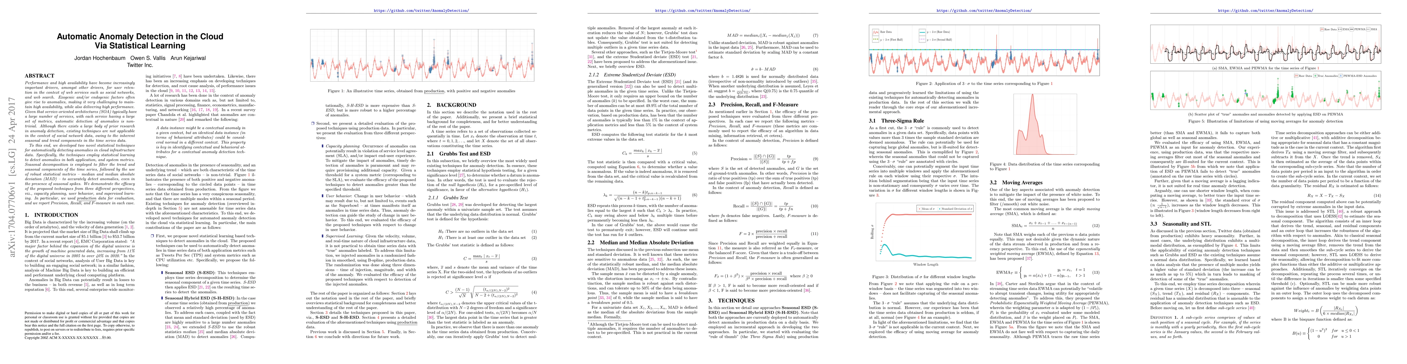 Performance and high availability have become increasingly important drivers, amongst other drivers, for user retention in the context of web services such as social networks, and web search. Exogenic and/or endogenic factors often give rise to anomalies, making it very challenging to maintain high availability, while also delivering high performance. Given that service-oriented architectures (SOA) typically have a large number of services, with each service having a large set of metrics, automatic detection of anomalies is non-trivial. Although there exists a large body of prior research in anomaly detection, existing techniques are not applicable in the context of social network data, owing to the inherent seasonal and trend components in the time series data. To this end, we developed two novel statistical techniques for automatically detecting anomalies in cloud infrastructure data. Specifically, the techniques employ statistical learning to detect anomalies in both application, and system metrics. Seasonal decomposition is employed to filter the trend and seasonal components of the time series, followed by the use of robust statistical metrics -- median and median absolute deviation (MAD) -- to accurately detect anomalies, even in the presence of seasonal spikes. We demonstrate the efficacy of the proposed techniques from three different perspectives, viz., capacity planning, user behavior, and supervised learning. In particular, we used production data for evaluation, and we report Precision, Recall, and F-measure in each case.