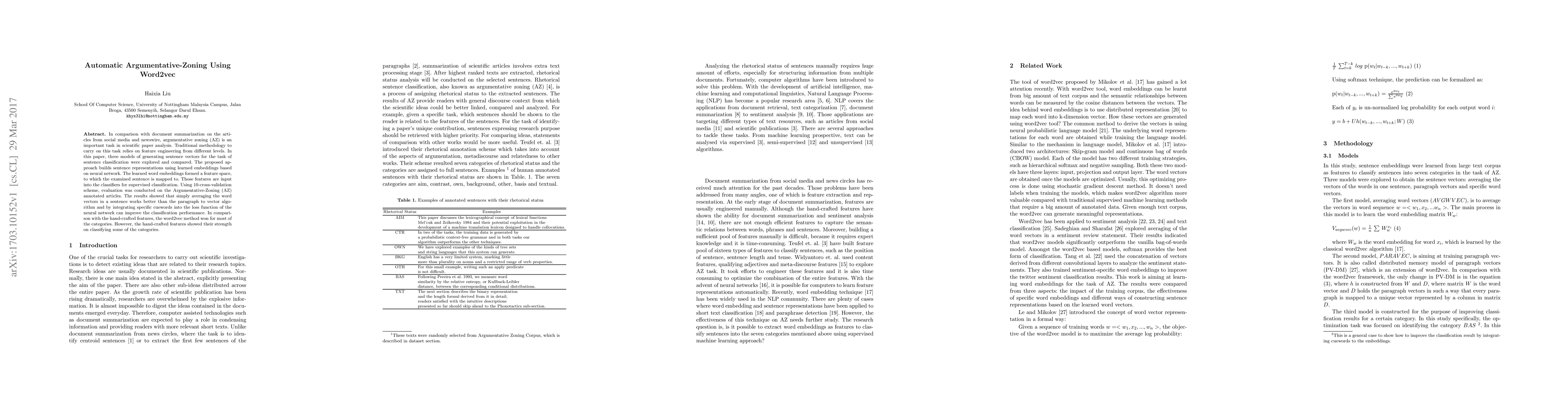 The paper presents a comparative analysis of different word embedding models for sentence classification in argumentative zoning, demonstrating that word embeddings trained on relevant corpora can capture semantic features of statements effectively.