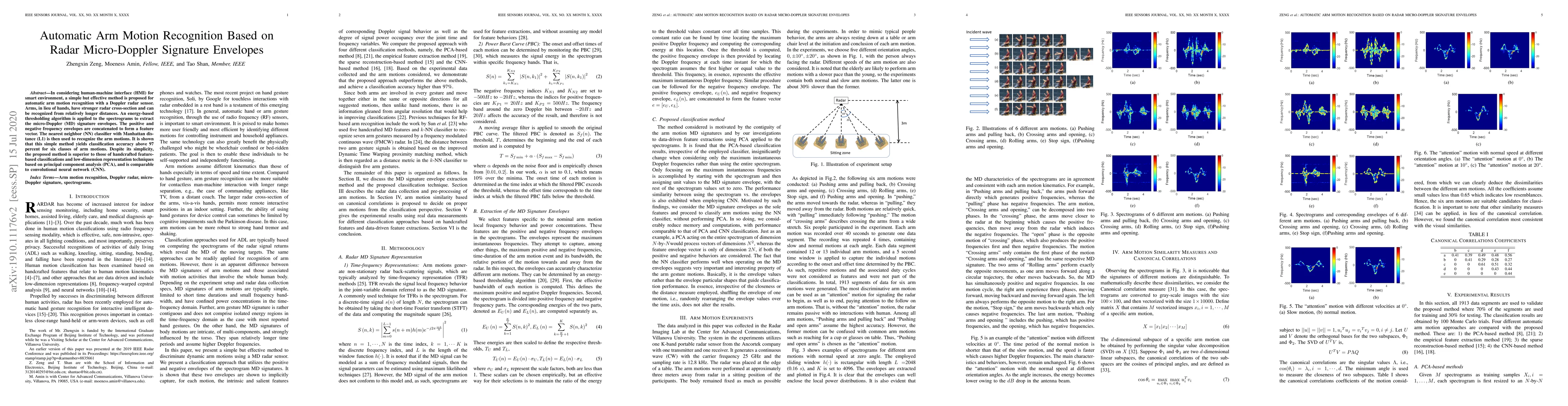 The paper proposes a simple radar-based method for automatic arm motion recognition using micro-Doppler signature envelopes, achieving over 97% accuracy. It outperforms handcrafted features and PCA, and is comparable to CNNs.