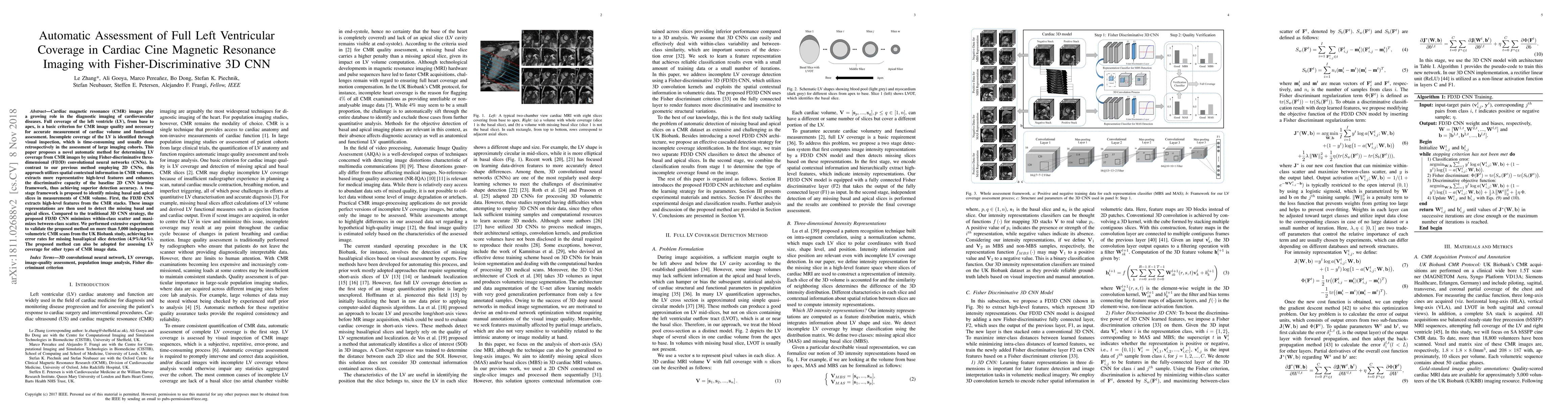 This paper introduces an automatic method using Fisher-discriminative 3D CNNs to assess full left ventricular coverage in cardiac cine MRI, improving upon previous 2D CNN methods by utilizing 3D spatial context for enhanced feature extraction and accuracy. The proposed two-stage framework achieved low error rates in detecting missing basal and apical slices in CMR scans from the UK Biobank study.