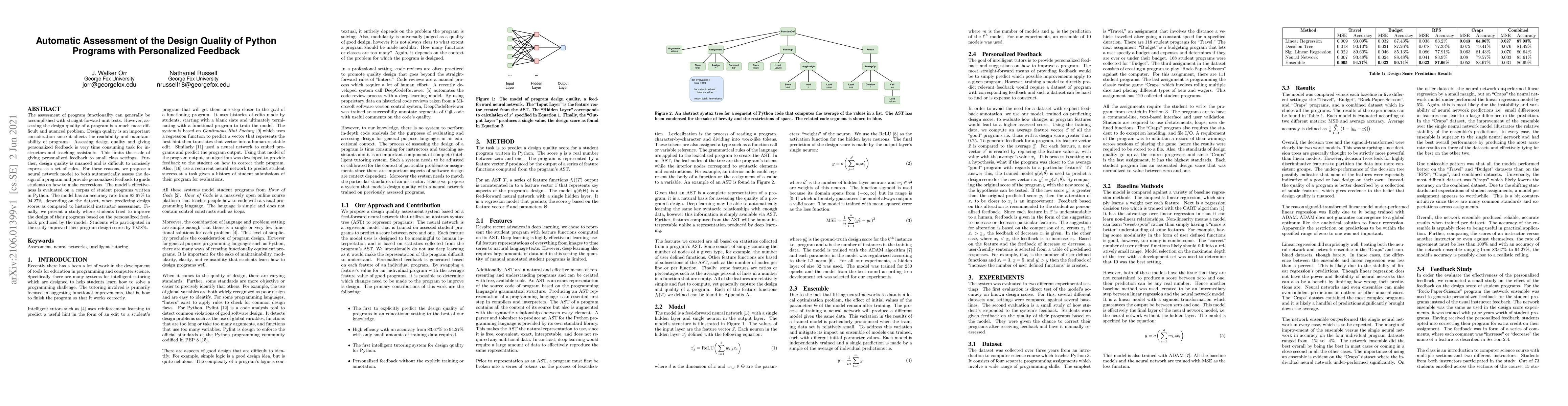 A neural network model assesses Python program design quality with 83.67-94.27% accuracy, providing personalized feedback to improve scores by 19.58%.