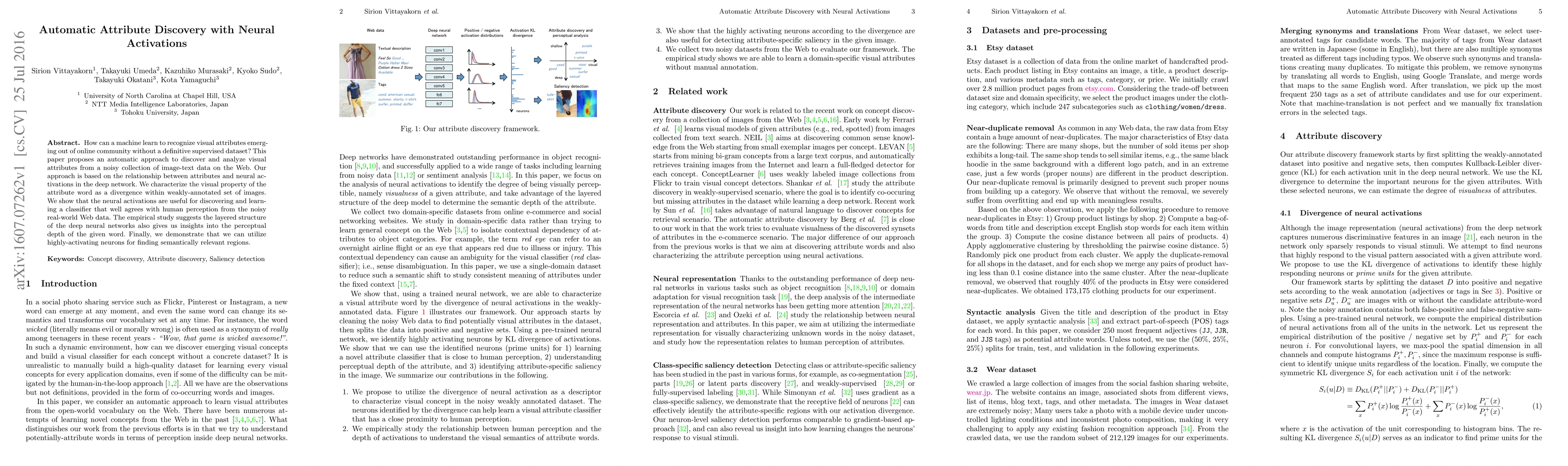 How can a machine learn to recognize visual attributes emerging out of online community without a definitive supervised dataset? This paper proposes an automatic approach to discover and analyze visual attributes from a noisy collection of image-text data on the Web. Our approach is based on the relationship between attributes and neural activations in the deep network. We characterize the visual property of the attribute word as a divergence within weakly-annotated set of images. We show that the neural activations are useful for discovering and learning a classifier that well agrees with human perception from the noisy real-world Web data. The empirical study suggests the layered structure of the deep neural networks also gives us insights into the perceptual depth of the given word. Finally, we demonstrate that we can utilize highly-activating neurons for finding semantically relevant regions.