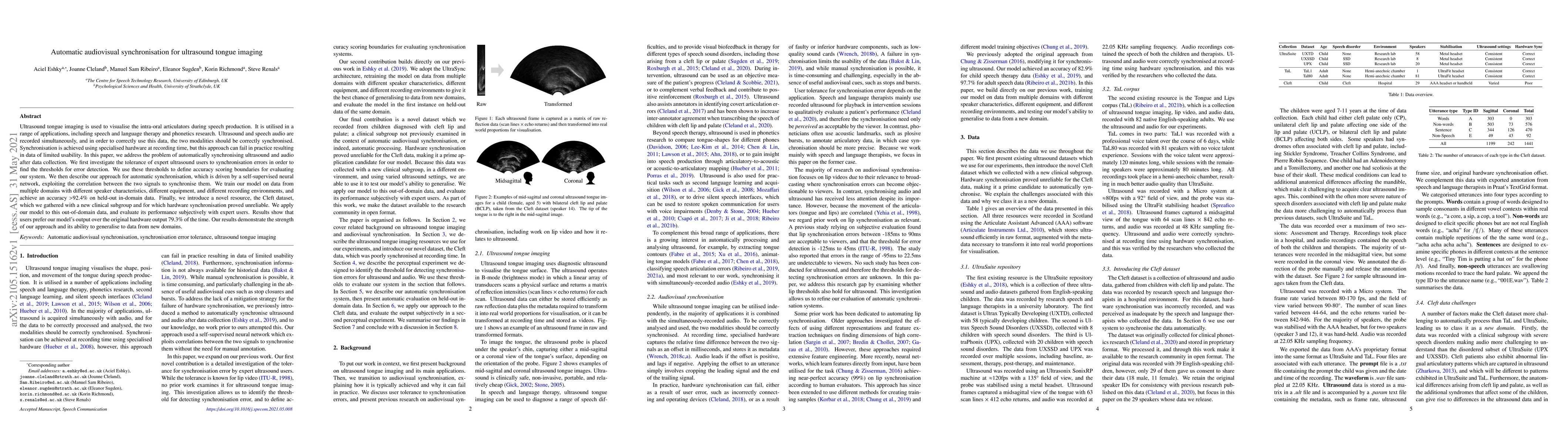 Ultrasound tongue imaging is used to visualise the intra-oral articulators during speech production. It is utilised in a range of applications, including speech and language therapy and phonetics research. Ultrasound and speech audio are recorded simultaneously, and in order to correctly use this data, the two modalities should be correctly synchronised. Synchronisation is achieved using specialised hardware at recording time, but this approach can fail in practice resulting in data of limited usability. In this paper, we address the problem of automatically synchronising ultrasound and audio after data collection. We first investigate the tolerance of expert ultrasound users to synchronisation errors in order to find the thresholds for error detection. We use these thresholds to define accuracy scoring boundaries for evaluating our system. We then describe our approach for automatic synchronisation, which is driven by a self-supervised neural network, exploiting the correlation between the two signals to synchronise them. We train our model on data from multiple domains with different speaker characteristics, different equipment, and different recording environments, and achieve an accuracy >92.4% on held-out in-domain data. Finally, we introduce a novel resource, the Cleft dataset, which we gathered with a new clinical subgroup and for which hardware synchronisation proved unreliable. We apply our model to this out-of-domain data, and evaluate its performance subjectively with expert users. Results show that users prefer our model's output over the original hardware output 79.3% of the time. Our results demonstrate the strength of our approach and its ability to generalise to data from new domains.