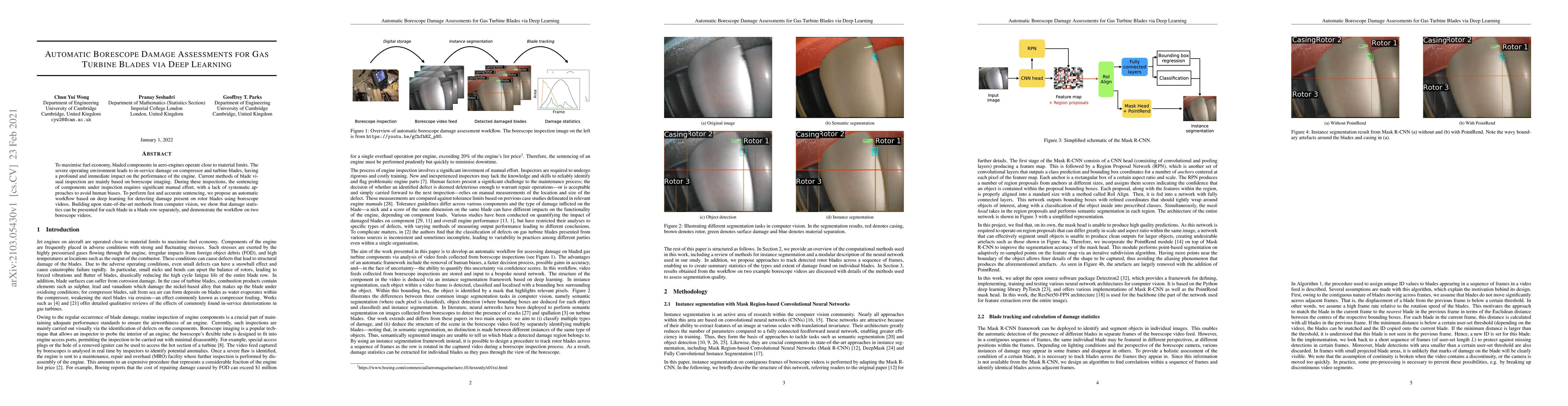 This paper proposes a deep learning-based automatic workflow for assessing damage on gas turbine blades using borescope videos, aiming to replace manual inspection methods and reduce human bias. The approach leverages computer vision to detect and quantify damage, providing detailed statistics for each blade in a row.