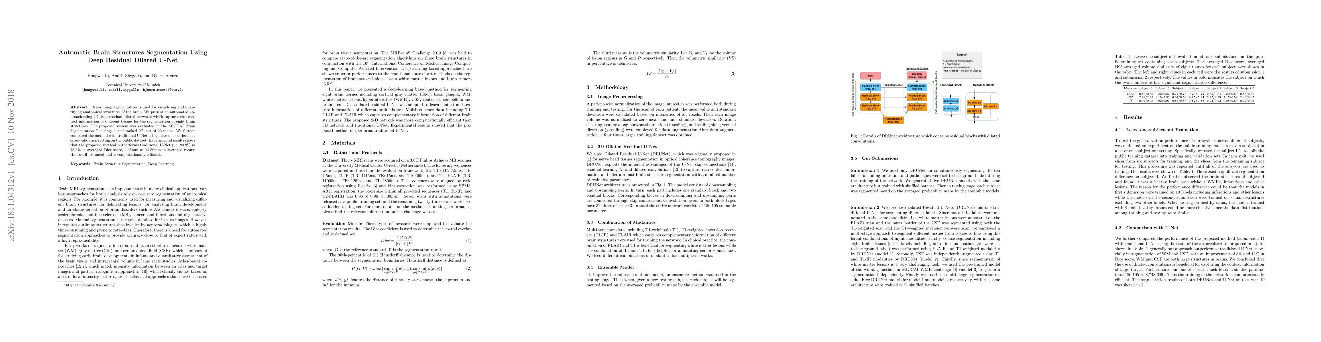 The research presents an automated approach for brain structure segmentation using a 2D deep residual dilated U-Net, which captures rich context information for segmenting eight brain structures. The method was evaluated in the MICCAI Brain Segmentation Challenge and compared with traditional U-Net using leave-one-subject-out cross-validation.