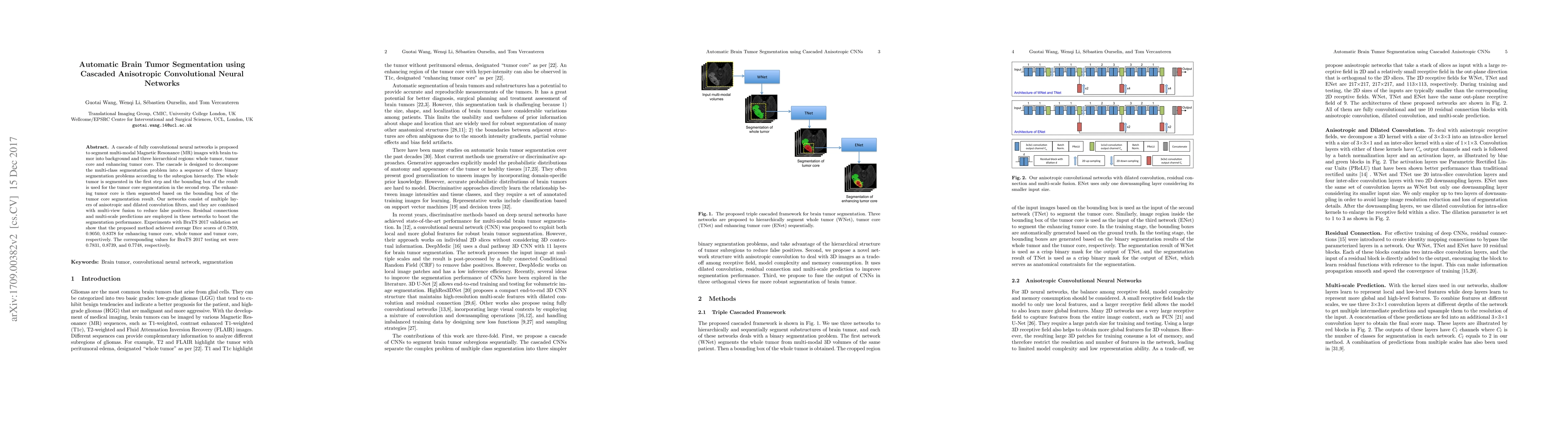 This paper proposes a cascaded convolutional neural network to segment brain tumors in multi-modal MR images into three hierarchical regions: whole tumor, tumor core, and enhancing tumor core. The method achieves high Dice scores on the BraTS 2017 dataset, demonstrating effective segmentation performance.