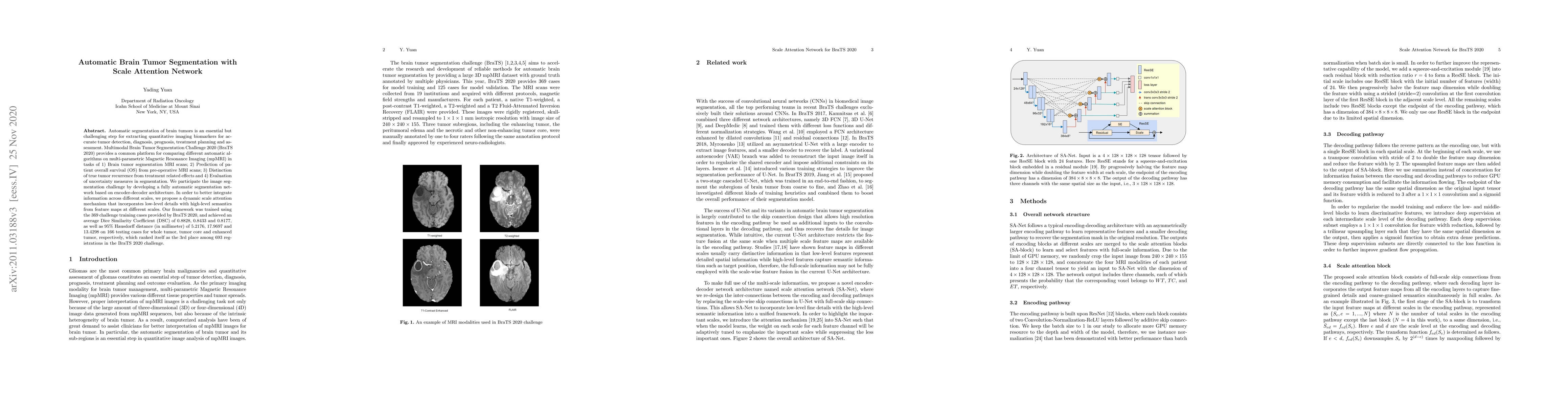 This paper presents an automatic brain tumor segmentation network with a scale attention mechanism, achieving high performance in the BraTS 2020 challenge. The proposed dynamic scale attention integrates multi-scale features, resulting in an average Dice Similarity Coefficient of 0.8828 for whole tumor segmentation and ranking 3rd among 693 participants.