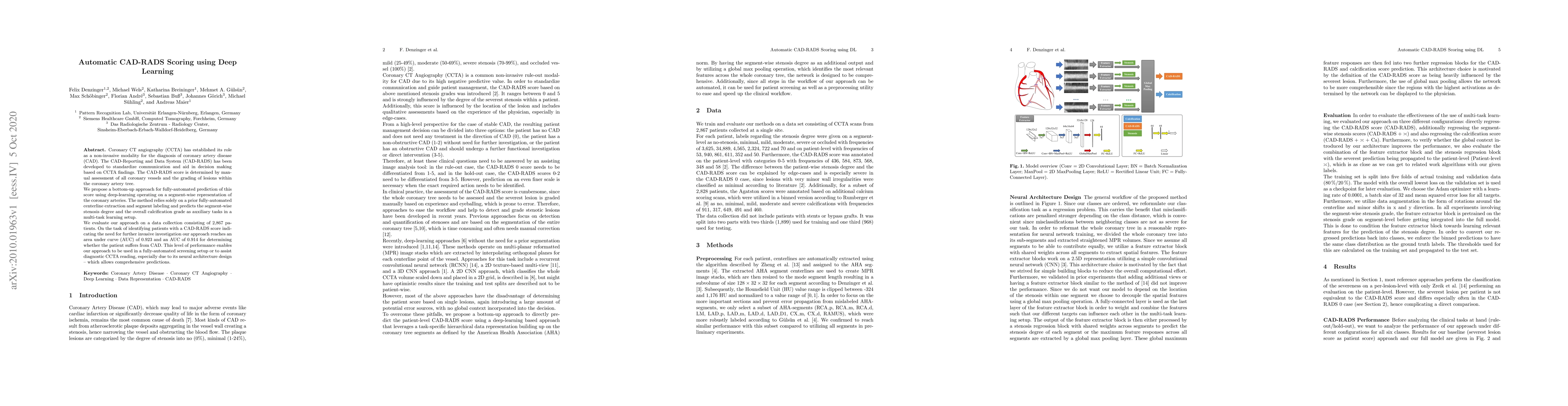 This research introduces a deep learning method for automatically scoring Coronary Artery Disease-Reporting and Data System (CAD-RADS) from Coronary CT Angiography (CCTA). The model, trained on 2,867 patients, accurately identifies patients needing further invasive investigation (AUC 0.923) and those suffering from CAD (AUC 0.914). This automated approach could streamline CCTA interpretation and decision-making processes.