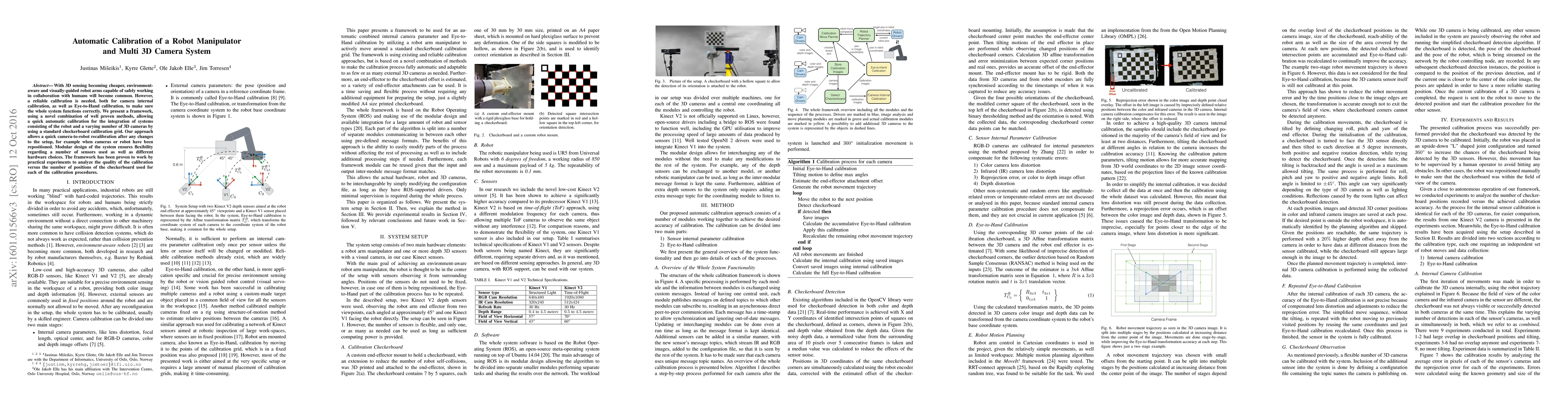 With 3D sensing becoming cheaper, environment-aware and visually-guided robot arms capable of safely working in collaboration with humans will become common. However, a reliable calibration is needed, both for camera internal calibration, as well as Eye-to-Hand calibration, to make sure the whole system functions correctly. We present a framework, using a novel combination of well proven methods, allowing a quick automatic calibration for the integration of systems consisting of the robot and a varying number of 3D cameras by using a standard checkerboard calibration grid. Our approach allows a quick camera-to-robot recalibration after any changes to the setup, for example when cameras or robot have been repositioned. Modular design of the system ensures flexibility regarding a number of sensors used as well as different hardware choices. The framework has been proven to work by practical experiments to analyze the quality of the calibration versus the number of positions of the checkerboard used for each of the calibration procedures.