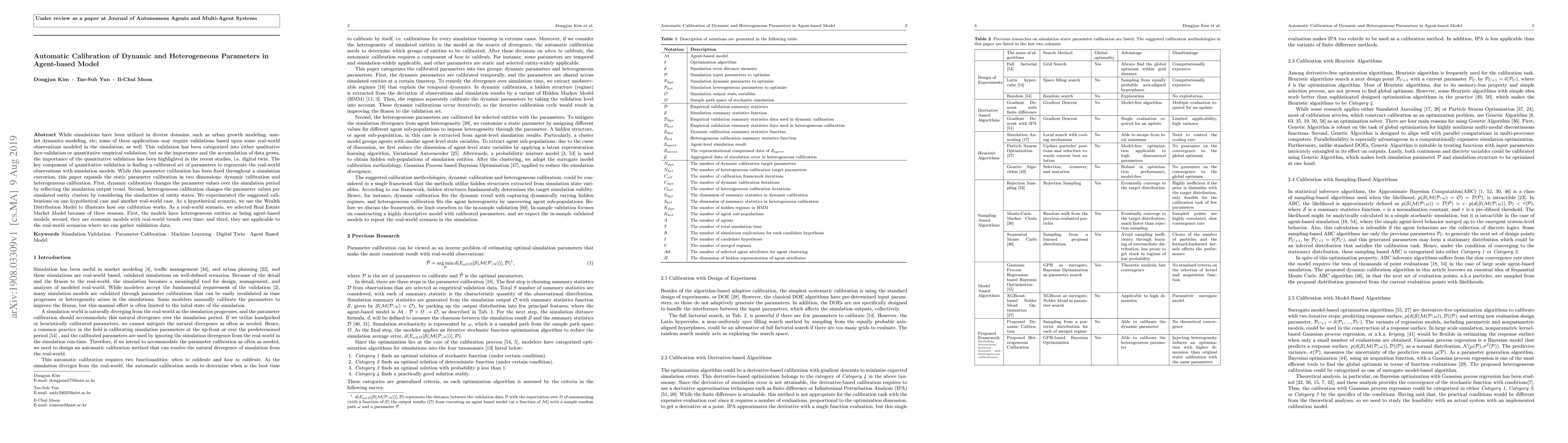 While simulations have been utilized in diverse domains, such as urban growth modeling, market dynamics modeling, etc; some of these applications may require validations based upon some real-world observations modeled in the simulation, as well. This validation has been categorized into either qualitative face-validation or quantitative empirical validation, but as the importance and the accumulation of data grows, the importance of the quantitative validation has been highlighted in the recent studies, i.e. digital twin. The key component of quantitative validation is finding a calibrated set of parameters to regenerate the real-world observations with simulation models. While this parameter calibration has been fixed throughout a simulation execution, this paper expands the static parameter calibration in two dimensions: dynamic calibration and heterogeneous calibration. First, dynamic calibration changes the parameter values over the simulation period by reflecting the simulation output trend. Second, heterogeneous calibration changes the parameter values per simulated entity clusters by considering the similarities of entity states. We experimented the suggested calibrations on one hypothetical case and another real-world case. As a hypothetical scenario, we use the Wealth Distribution Model to illustrate how our calibration works. As a real-world scenario, we selected Real Estate Market Model because of three reasons. First, the models have heterogeneous entities as being agent-based models; second, they are economic models with real-world trends over time; and third, they are applicable to the real-world scenarios where we can gather validation data.