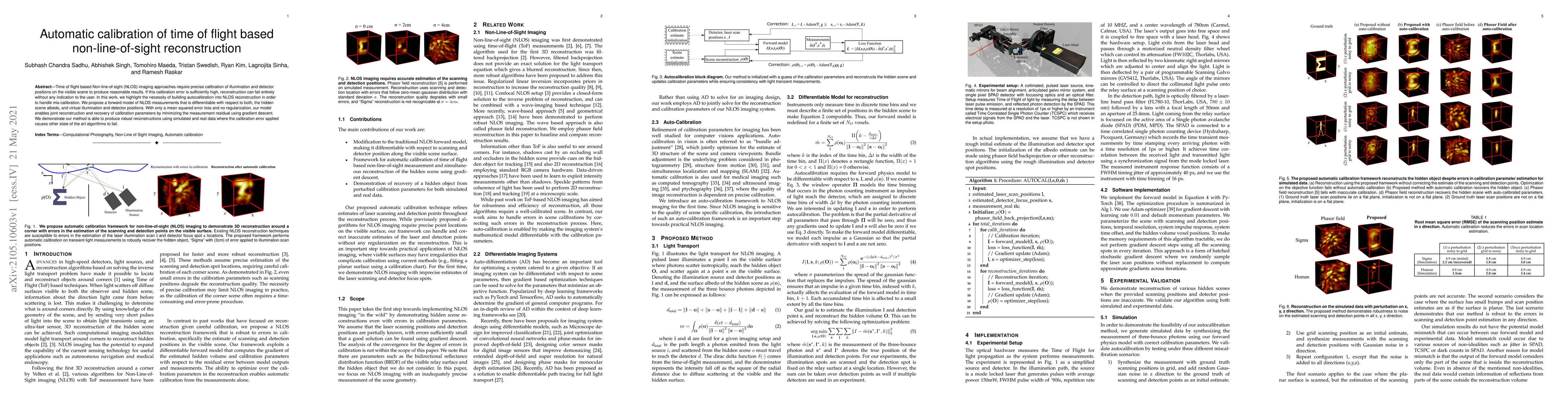 This paper proposes an automatic calibration method for time of flight based Non-line-of-sight (NLOS) imaging, addressing the issue of reconstruction failure due to calibration errors. The method uses a differentiable forward model to jointly reconstruct the hidden scene and recover calibration parameters, demonstrating robustness with both simulated and real data.