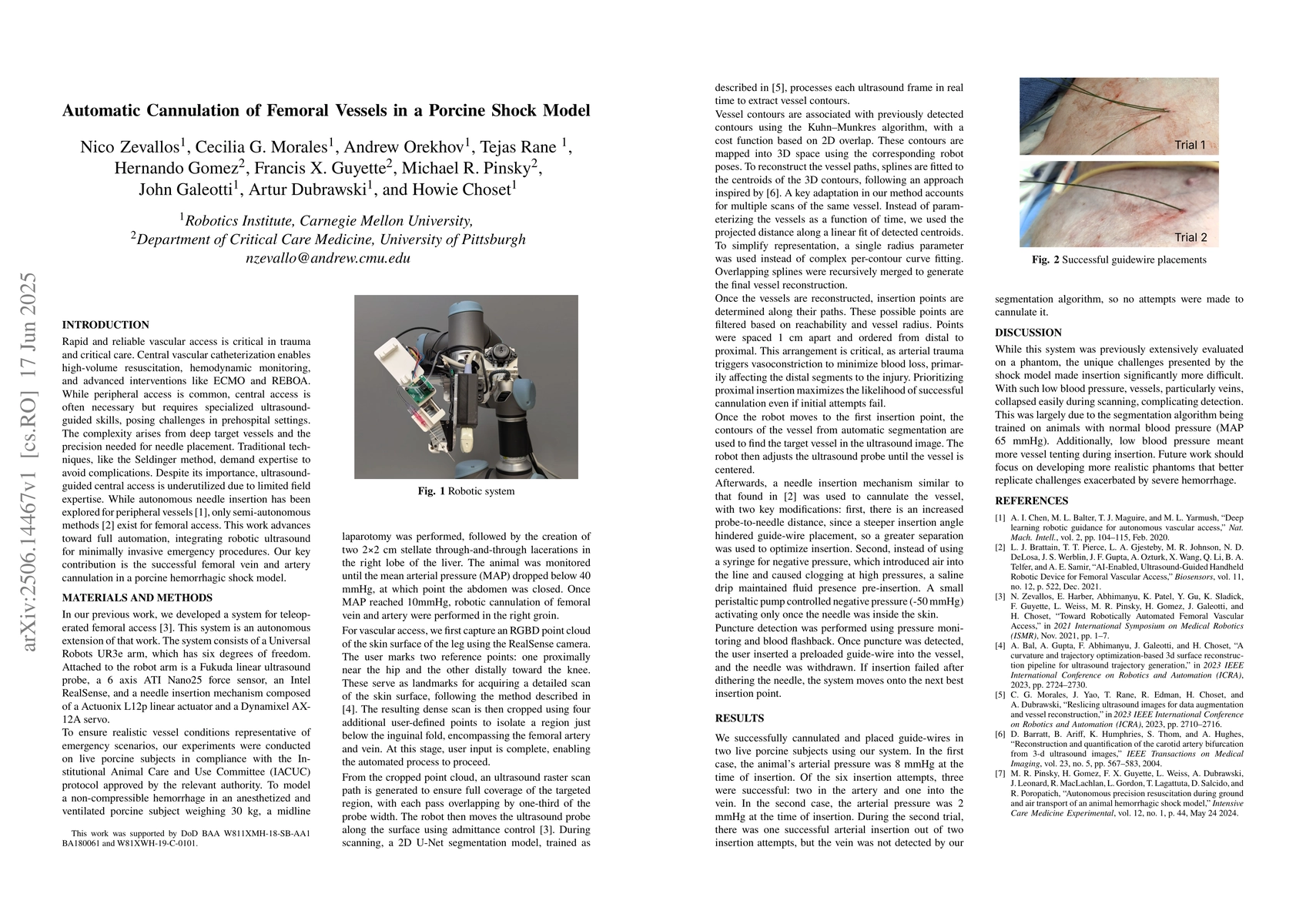 The research utilized a robotic system consisting of a Universal Robots UR3 arm, a Fukuda linear ultrasound probe, a 6-axis ATI Nano 25 force sensor, an Intel RealSense camera, and a needle insertion mechanism. The system was tested on live porcine subjects under anesthesia, with a midline laparotomy followed by stellate through-and-through liver lacerations to model non-compressible hemorrhage. Robotic cannulation of femoral vein and artery was performed once the mean arterial pressure (MAP) dropped below 40 mmHg.