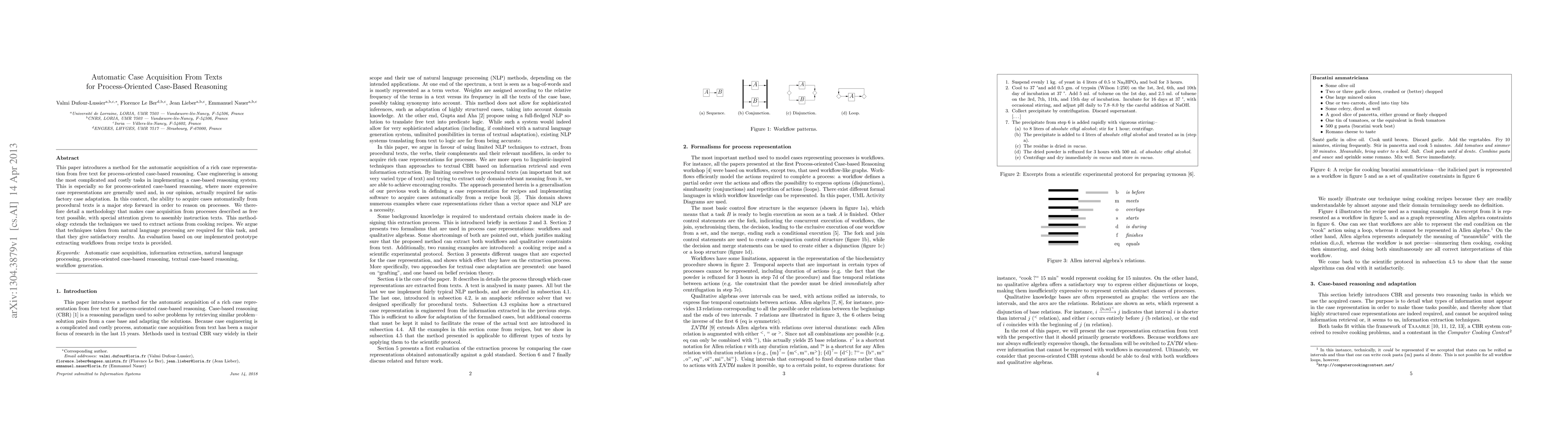 This paper presents a methodology for automatically acquiring detailed case representations from free text to facilitate process-oriented case-based reasoning, emphasizing the use of natural language processing techniques and demonstrating its effectiveness through a prototype extracting workflows from recipe texts. The method aims to reduce the complexity and cost associated with traditional case engineering in case-based reasoning systems.