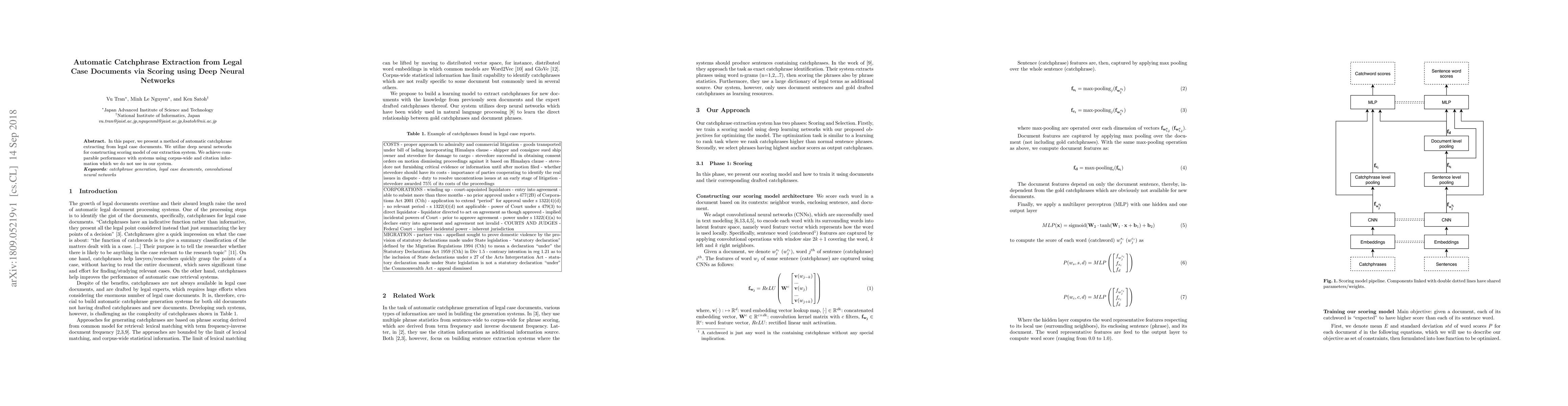 Summary: This paper introduces a deep neural network-based method for automatically extracting catchphrases from legal case documents, achieving competitive performance without relying on corpus-wide or citation information.