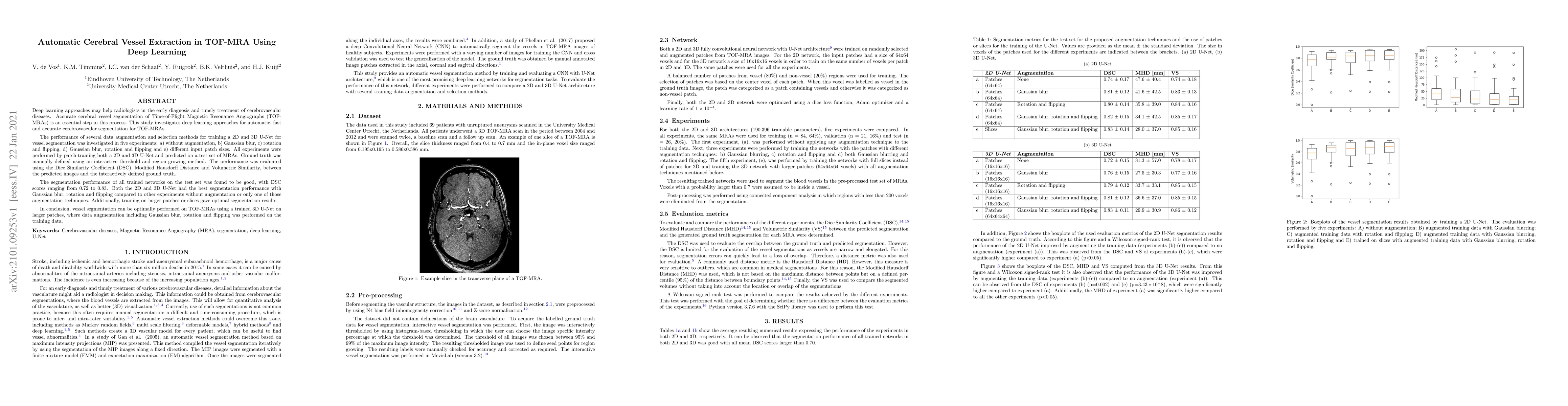 This study explores deep learning methods for automatic cerebral vessel segmentation in Time-of-Flight Magnetic Resonance Angiographs (TOF-MRAs), finding that 2D and 3D U-Nets with data augmentation techniques like Gaussian blur, rotation, and flipping yield the best results, achieving Dice Similarity Coefficient scores ranging from 0.72 to 0.83.