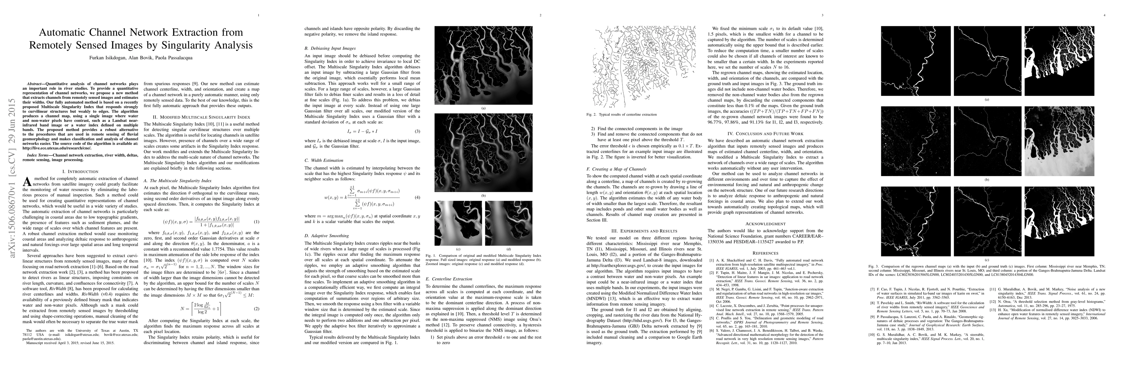 Quantitative analysis of channel networks plays an important role in river studies. To provide a quantitative representation of channel networks, we propose a new method that extracts channels from remotely sensed images and estimates their widths. Our fully automated method is based on a recently proposed Multiscale Singularity Index that responds strongly to curvilinear structures but weakly to edges. The algorithm produces a channel map, using a single image where water and non-water pixels have contrast, such as a Landsat near-infrared band image or a water index defined on multiple bands. The proposed method provides a robust alternative to the procedures that are used in remote sensing of fluvial geomorphology and makes classification and analysis of channel networks easier. The source code of the algorithm is available at: http://live.ece.utexas.edu/research/cne/.