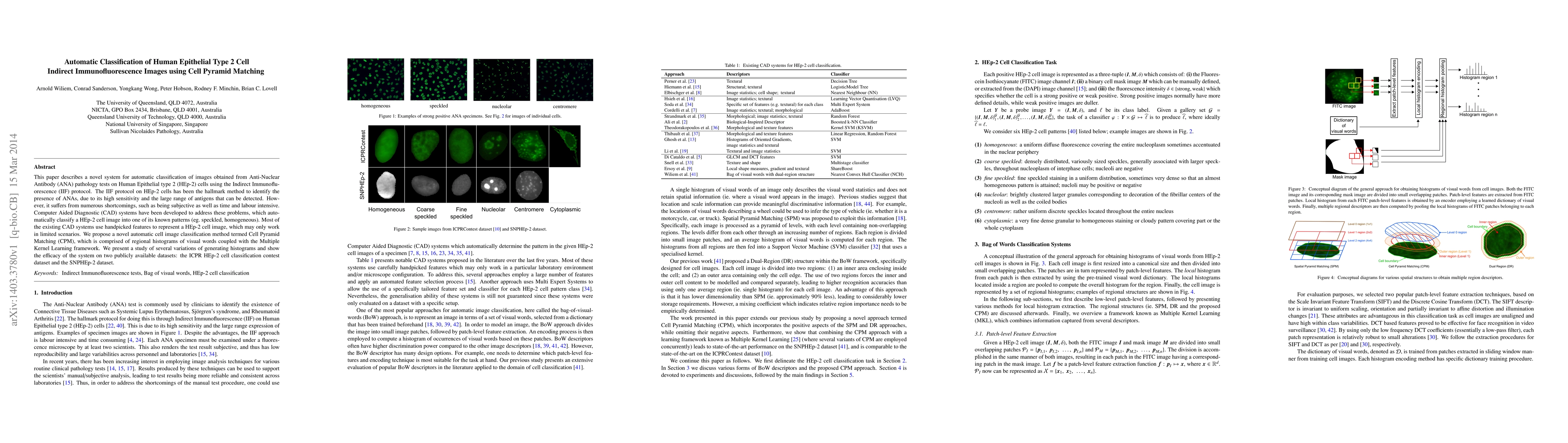 This paper describes a novel system for automatic classification of images obtained from Anti-Nuclear Antibody (ANA) pathology tests on Human Epithelial type 2 (HEp-2) cells using the Indirect Immunofluorescence (IIF) protocol. The IIF protocol on HEp-2 cells has been the hallmark method to identify the presence of ANAs, due to its high sensitivity and the large range of antigens that can be detected. However, it suffers from numerous shortcomings, such as being subjective as well as time and labour intensive. Computer Aided Diagnostic (CAD) systems have been developed to address these problems, which automatically classify a HEp-2 cell image into one of its known patterns (eg. speckled, homogeneous). Most of the existing CAD systems use handpicked features to represent a HEp-2 cell image, which may only work in limited scenarios. We propose a novel automatic cell image classification method termed Cell Pyramid Matching (CPM), which is comprised of regional histograms of visual words coupled with the Multiple Kernel Learning framework. We present a study of several variations of generating histograms and show the efficacy of the system on two publicly available datasets: the ICPR HEp-2 cell classification contest dataset and the SNPHEp-2 dataset.