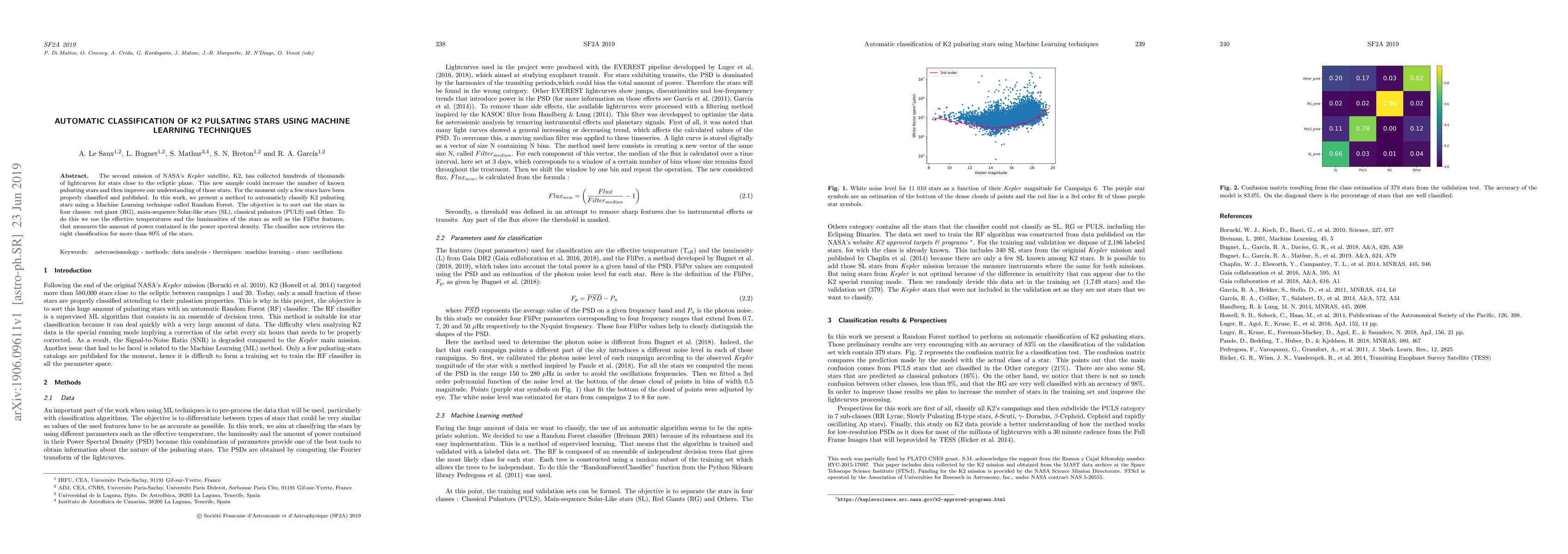 The second mission of the NASA Kepler satellite, K2, has collected hundreds of thousands of lightcurves for stars close to the ecliptic plane. This new sample could increase the number of known pulsating stars and then improve our understanding of those stars. For the moment only a few stars have been properly classified and published. In this work, we present a method to automaticly classify K2 pulsating stars using a Machine Learning technique called Random Forest. The objective is to sort out the stars in four classes: red giant (RG), main-sequence Solar-like stars (SL), classical pulsators (PULS) and Other. To do this we use the effective temperatures and the luminosities of the stars as well as the FliPer features, that measures the amount of power contained in the power spectral density. The classifier now retrieves the right classification for more than 80% of the stars.