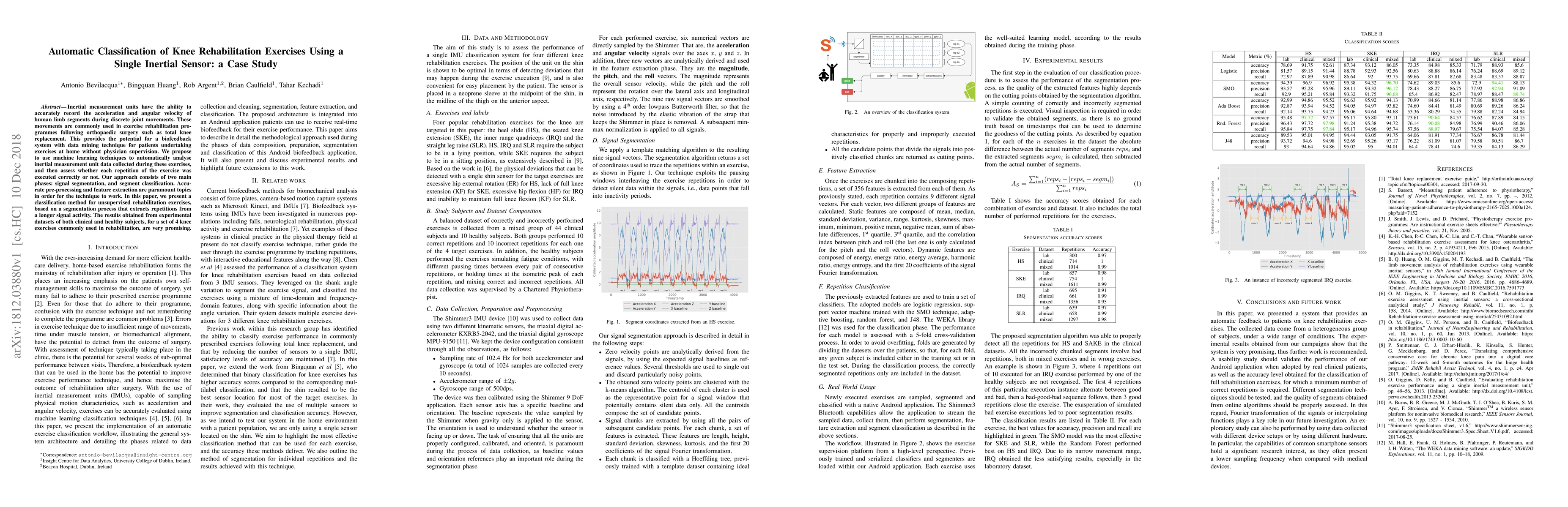 This paper proposes a machine learning method to automatically classify knee rehabilitation exercises using data from a single inertial sensor. The method involves signal segmentation and classification to determine if exercise repetitions are performed correctly. Experimental results show promising outcomes for four common knee exercises.
