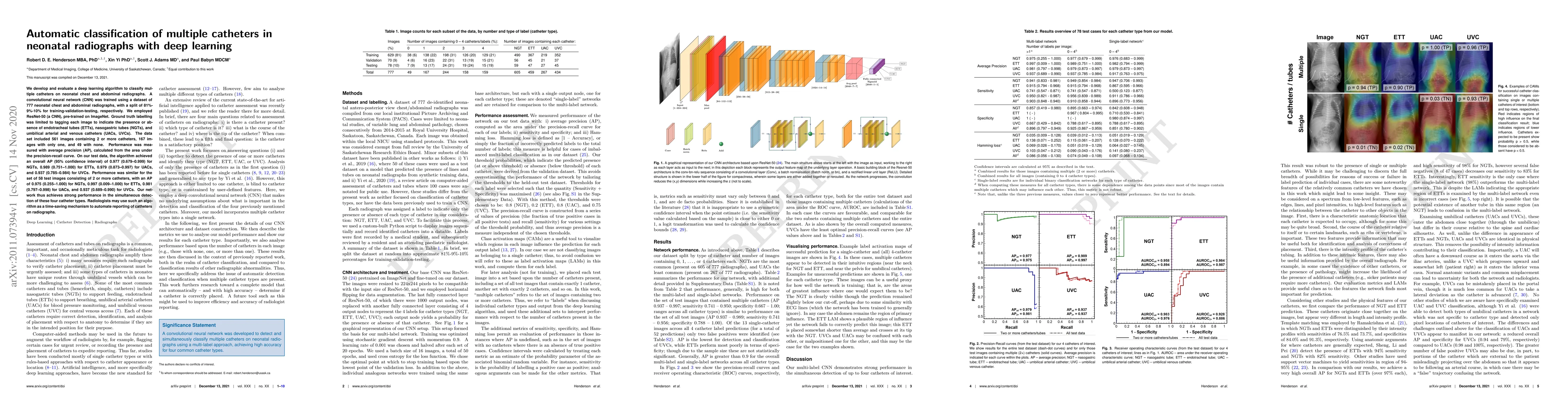 A deep learning algorithm was developed to automatically classify multiple catheters on neonatal radiographs with high accuracy, achieving strong performance in detecting four types of catheters.