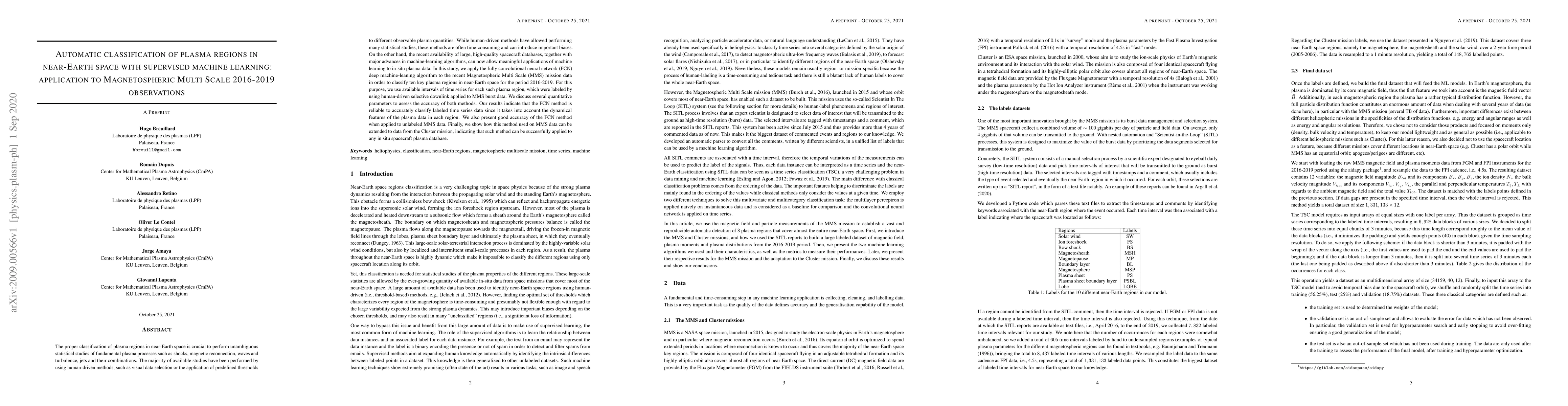 The proper classification of plasma regions in near-Earth space is crucial to perform unambiguous statistical studies of fundamental plasma processes such as shocks, magnetic reconnection, waves and turbulence, jets and their combinations. The majority of available studies have been performed by using human-driven methods, such as visual data selection or the application of predefined thresholds to different observable plasma quantities. While human-driven methods have allowed performing many statistical studies, these methods are often time-consuming and can introduce important biases. On the other hand, the recent availability of large, high-quality spacecraft databases, together with major advances in machine-learning algorithms, can now allow meaningful applications of machine learning to in-situ plasma data. In this study, we apply the fully convolutional neural network (FCN) deep machine-leaning algorithm to the recent Magnetospheric Multi Scale (MMS) mission data in order to classify ten key plasma regions in near-Earth space for the period 2016-2019. For this purpose, we use available intervals of time series for each such plasma region, which were labeled by using human-driven selective downlink applied to MMS burst data. We discuss several quantitative parameters to assess the accuracy of both methods. Our results indicate that the FCN method is reliable to accurately classify labeled time series data since it takes into account the dynamical features of the plasma data in each region. We also present good accuracy of the FCN method when applied to unlabeled MMS data. Finally, we show how this method used on MMS data can be extended to data from the Cluster mission, indicating that such method can be successfully applied to any in situ spacecraft plasma database.