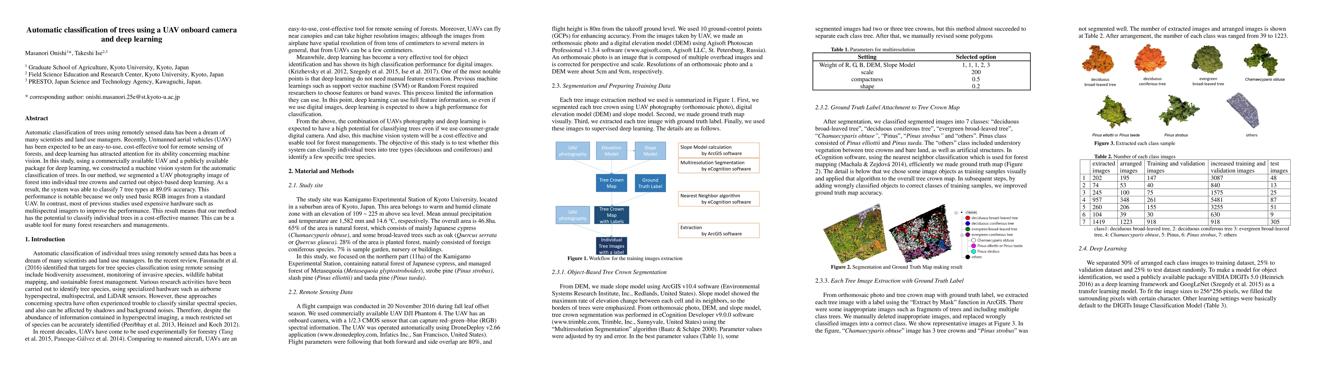 Automatic classification of trees using remotely sensed data has been a dream of many scientists and land use managers. Recently, Unmanned aerial vehicles (UAV) has been expected to be an easy-to-use, cost-effective tool for remote sensing of forests, and deep learning has attracted attention for its ability concerning machine vision. In this study, using a commercially available UAV and a publicly available package for deep learning, we constructed a machine vision system for the automatic classification of trees. In our method, we segmented a UAV photography image of forest into individual tree crowns and carried out object-based deep learning. As a result, the system was able to classify 7 tree types at 89.0% accuracy. This performance is notable because we only used basic RGB images from a standard UAV. In contrast, most of previous studies used expensive hardware such as multispectral imagers to improve the performance. This result means that our method has the potential to classify individual trees in a cost-effective manner. This can be a usable tool for many forest researchers and managements.