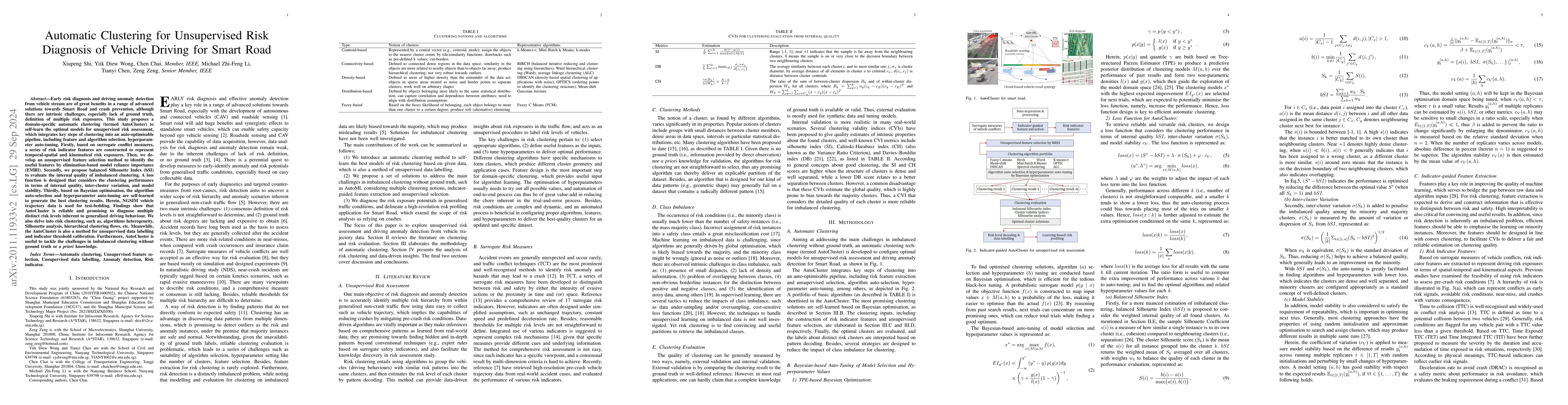 Early risk diagnosis and driving anomaly detection from vehicle stream are of great benefits in a range of advanced solutions towards Smart Road and crash prevention, although there are intrinsic challenges, especially lack of ground truth, definition of multiple risk exposures. This study proposes a domain-specific automatic clustering (termed Autocluster) to self-learn the optimal models for unsupervised risk assessment, which integrates key steps of risk clustering into an auto-optimisable pipeline, including feature and algorithm selection, hyperparameter auto-tuning. Firstly, based on surrogate conflict measures, indicator-guided feature extraction is conducted to construct temporal-spatial and kinematical risk features. Then we develop an elimination-based model reliance importance (EMRI) method to unsupervised-select the useful features. Secondly, we propose balanced Silhouette Index (bSI) to evaluate the internal quality of imbalanced clustering. A loss function is designed that considers the clustering performance in terms of internal quality, inter-cluster variation, and model stability. Thirdly, based on Bayesian optimisation, the algorithm selection and hyperparameter auto-tuning are self-learned to generate the best clustering partitions. Various algorithms are comprehensively investigated. Herein, NGSIM vehicle trajectory data is used for test-bedding. Findings show that Autocluster is reliable and promising to diagnose multiple distinct risk exposures inherent to generalised driving behaviour. Besides, we also delve into risk clustering, such as, algorithms heterogeneity, Silhouette analysis, hierarchical clustering flows, etc. Meanwhile, the Autocluster is also a method for unsupervised multi-risk data labelling and indicator threshold calibration. Furthermore, Autocluster is useful to tackle the challenges in imbalanced clustering without ground truth or priori knowledge