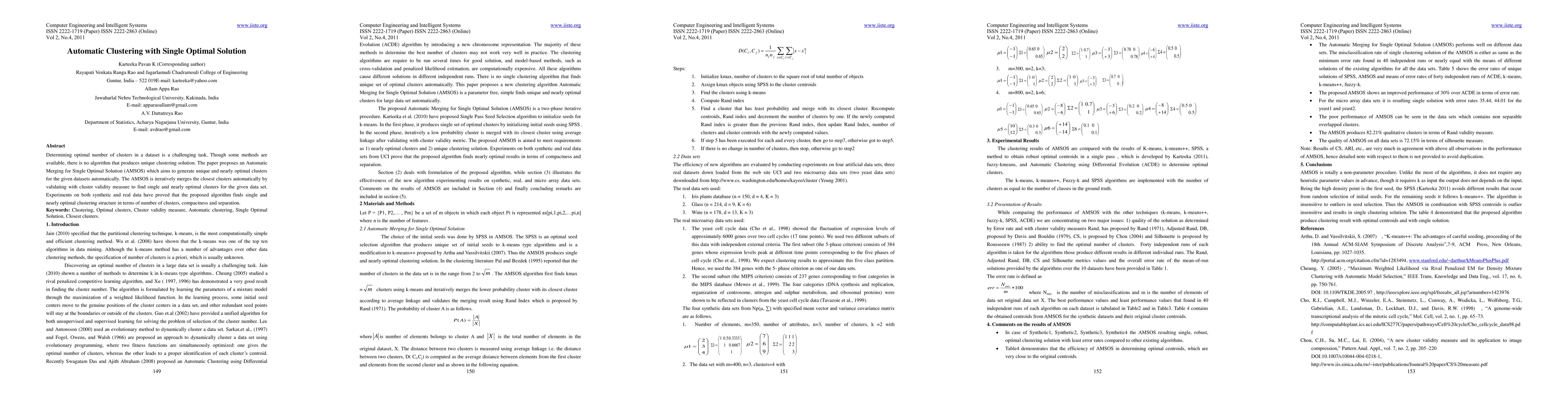 Determining optimal number of clusters in a dataset is a challenging task. Though some methods are available, there is no algorithm that produces unique clustering solution. The paper proposes an Automatic Merging for Single Optimal Solution (AMSOS) which aims to generate unique and nearly optimal clusters for the given datasets automatically. The AMSOS is iteratively merges the closest clusters automatically by validating with cluster validity measure to find single and nearly optimal clusters for the given data set. Experiments on both synthetic and real data have proved that the proposed algorithm finds single and nearly optimal clustering structure in terms of number of clusters, compactness and separation.