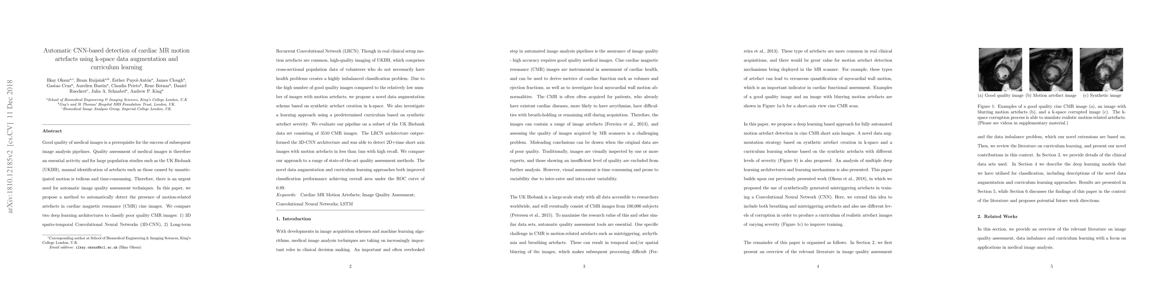 This paper proposes an automatic CNN-based method for detecting motion artefacts in cardiac MR images using k-space data augmentation and curriculum learning. The LRCN architecture outperformed the 3D-CNN, achieving high recall and fast detection times, with the novel techniques improving classification performance to an AUC of 0.89.