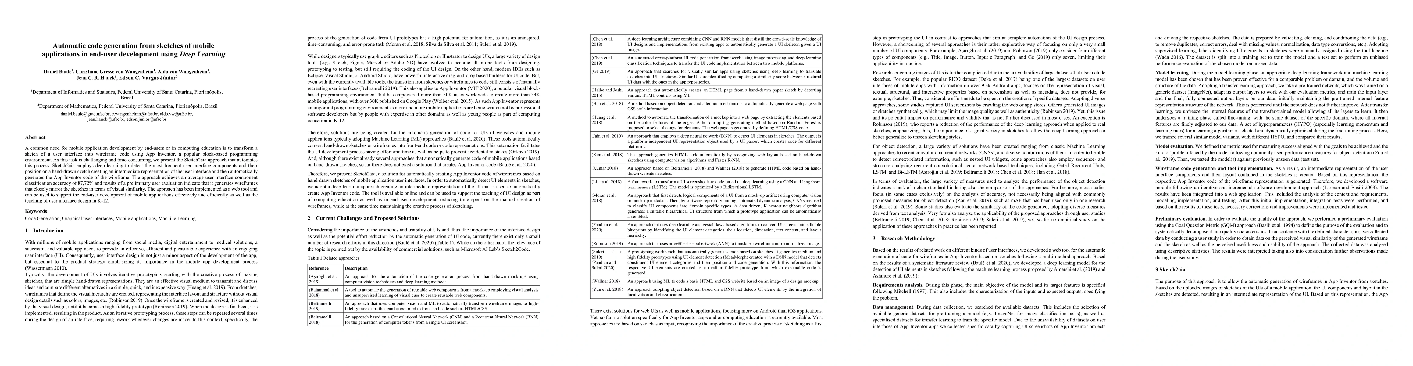 A common need for mobile application development by end-users or in computing education is to transform a sketch of a user interface into wireframe code using App Inventor, a popular block-based programming environment. As this task is challenging and time-consuming, we present the Sketch2aia approach that automates this process. Sketch2aia employs deep learning to detect the most frequent user interface components and their position on a hand-drawn sketch creating an intermediate representation of the user interface and then automatically generates the App Inventor code of the wireframe. The approach achieves an average user interface component classification accuracy of 87,72% and results of a preliminary user evaluation indicate that it generates wireframes that closely mirror the sketches in terms of visual similarity. The approach has been implemented as a web tool and can be used to support the end-user development of mobile applications effectively and efficiently as well as the teaching of user interface design in K-12.