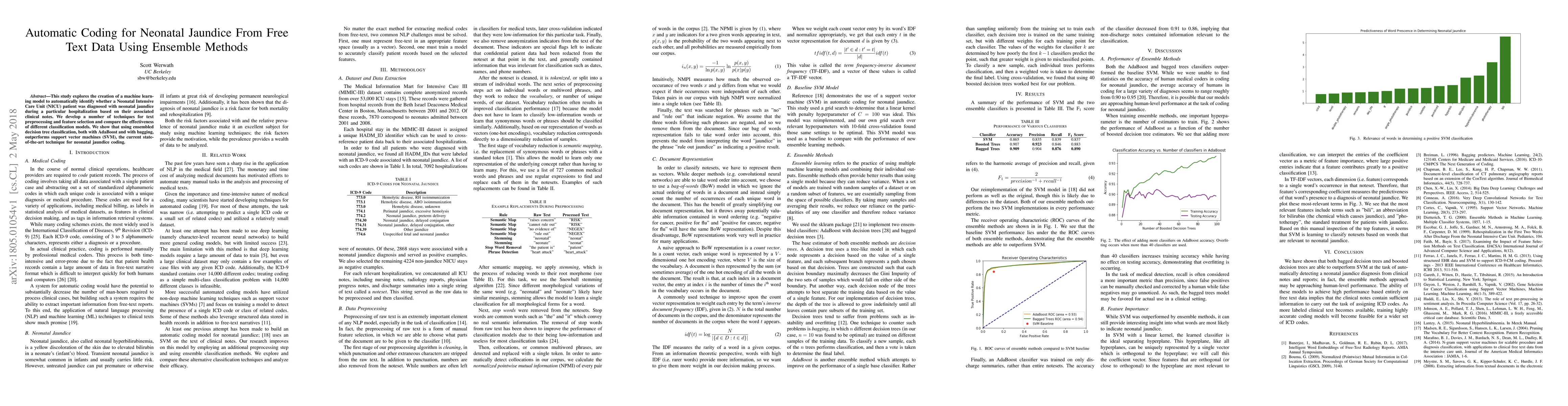 This study explores the creation of a machine learning model to automatically identify whether a Neonatal Intensive Care Unit (NICU) patient was diagnosed with neonatal jaundice during a particular hospitalization based on their associated clinical notes. We develop a number of techniques for text preprocessing and feature selection and compare the effectiveness of different classification models. We show that using ensemble decision tree classification, both with AdaBoost and with bagging, outperforms support vector machines (SVM), the current state-of-the-art technique for neonatal jaundice coding.