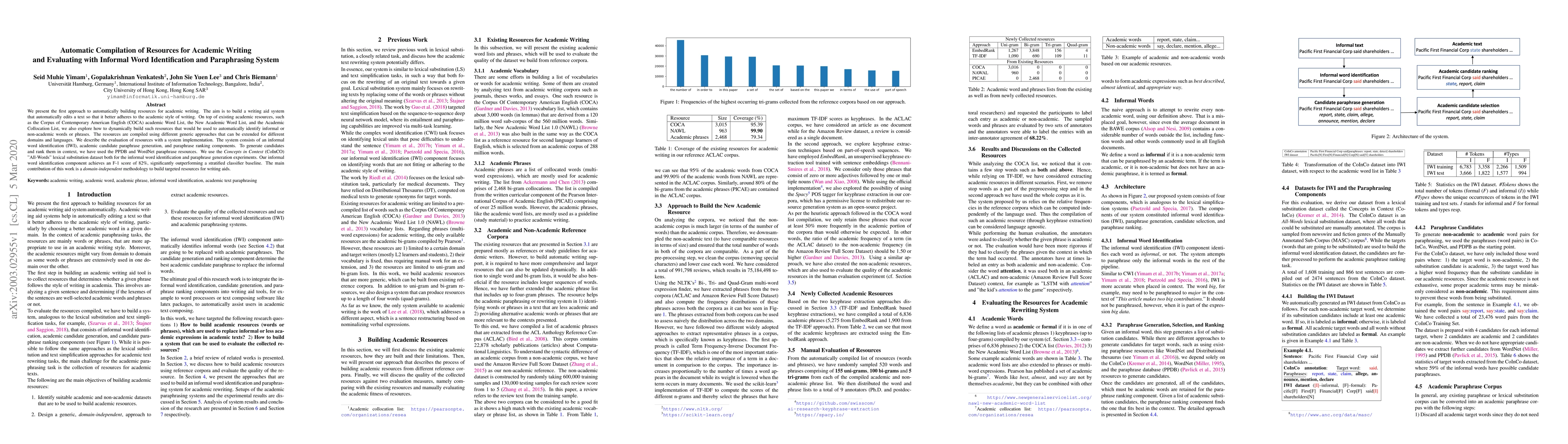 We present the first approach to automatically building resources for academic writing. The aim is to build a writing aid system that automatically edits a text so that it better adheres to the academic style of writing. On top of existing academic resources, such as the Corpus of Contemporary American English (COCA) academic Word List, the New Academic Word List, and the Academic Collocation List, we also explore how to dynamically build such resources that would be used to automatically identify informal or non-academic words or phrases. The resources are compiled using different generic approaches that can be extended for different domains and languages. We describe the evaluation of resources with a system implementation. The system consists of an informal word identification (IWI), academic candidate paraphrase generation, and paraphrase ranking components. To generate candidates and rank them in context, we have used the PPDB and WordNet paraphrase resources. We use the Concepts in Context (CoInCO) "All-Words" lexical substitution dataset both for the informal word identification and paraphrase generation experiments. Our informal word identification component achieves an F-1 score of 82%, significantly outperforming a stratified classifier baseline. The main contribution of this work is a domain-independent methodology to build targeted resources for writing aids.