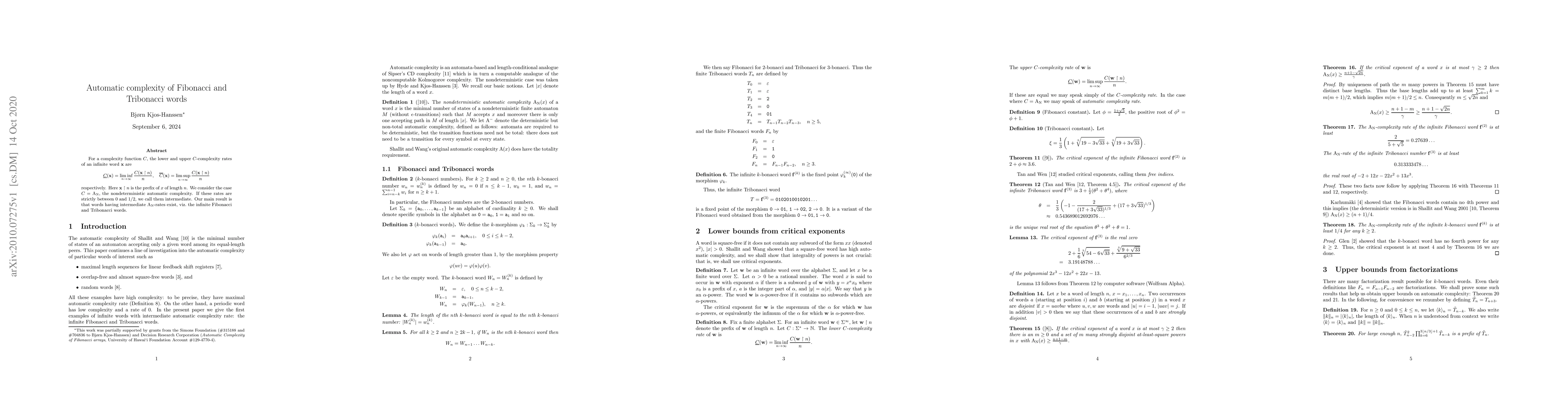 For a complexity function $C$, the lower and upper $C$-complexity rates of an infinite word $\mathbf{x}$ are \[ \underline{C}(\mathbf x)=\liminf_{n\to\infty} \frac{C(\mathbf{x}\upharpoonright n)}n,\quad \overline{C}(\mathbf x)=\limsup_{n\to\infty} \frac{C(\mathbf{x}\upharpoonright n)}n \] respectively. Here $\mathbf{x}\upharpoonright n$ is the prefix of $x$ of length $n$. We consider the case $C=\mathrm{A_N}$, the nondeterministic automatic complexity. If these rates are strictly between 0 and $1/2$, we call them intermediate. Our main result is that words having intermediate $\mathrm{A_N}$-rates exist, viz. the infinite Fibonacci and Tribonacci words.