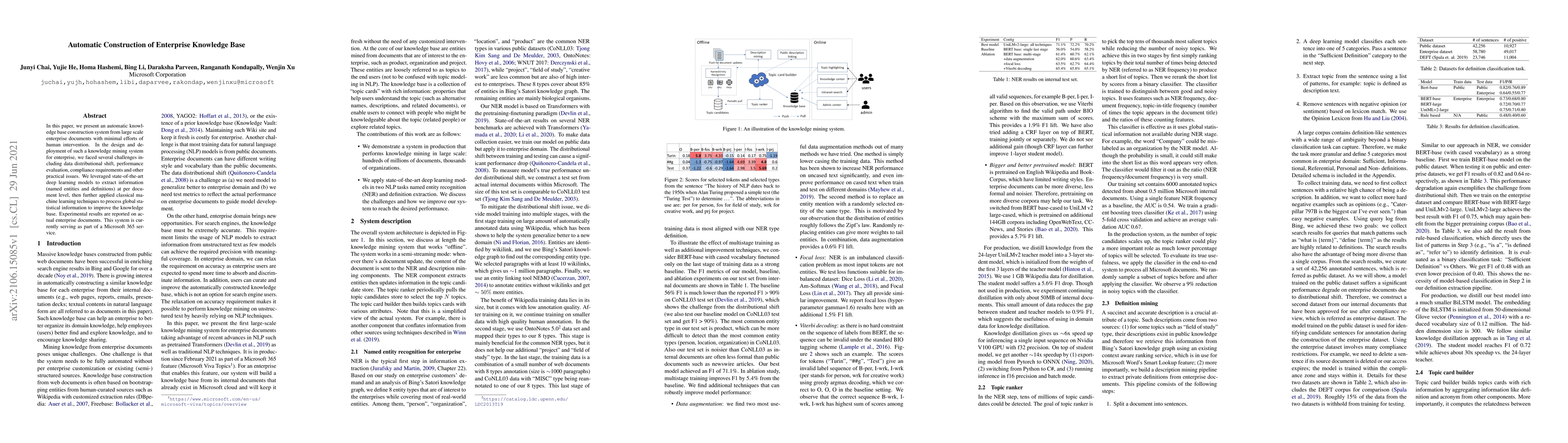 This paper introduces an automatic system for constructing enterprise knowledge bases from large-scale documents with minimal human intervention, using deep learning for local information extraction and machine learning for global statistical improvements. The system addresses challenges like data shifts and compliance, and is operational as part of a Microsoft 365 service.