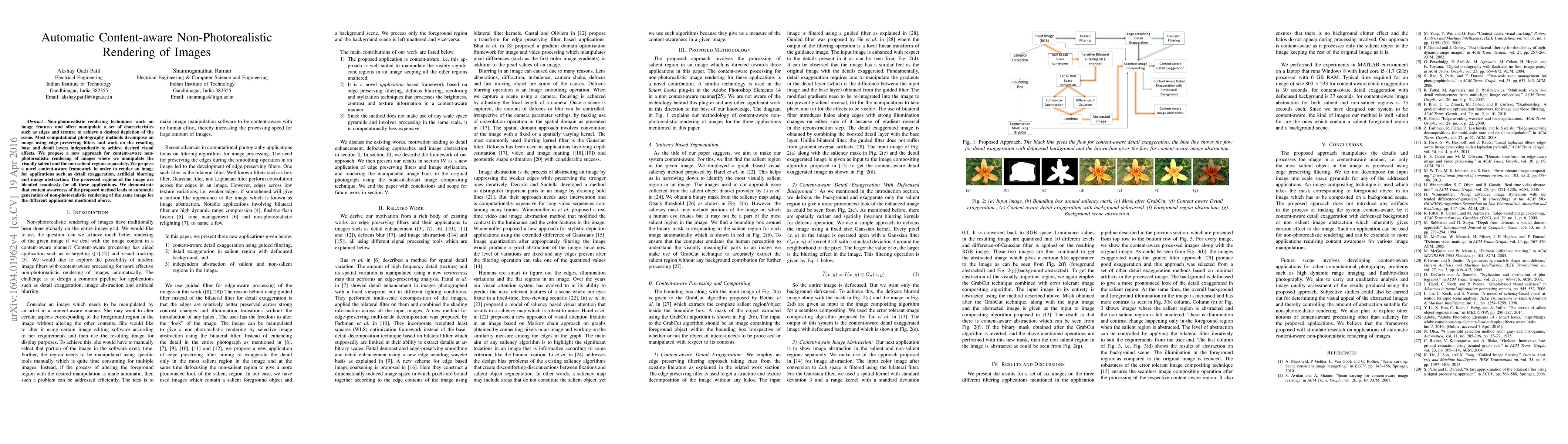 Non-photorealistic rendering techniques work on image features and often manipulate a set of characteristics such as edges and texture to achieve a desired depiction of the scene. Most computational photography methods decompose an image using edge preserving filters and work on the resulting base and detail layers independently to achieve desired visual effects. We propose a new approach for content-aware non-photorealistic rendering of images where we manipulate the visually salient and the non-salient regions separately. We propose a novel content-aware framework in order to render an image for applications such as detail exaggeration, artificial blurring and image abstraction. The processed regions of the image are blended seamlessly for all these applications. We demonstrate that content awareness of the proposed method leads to automatic generation of non-photorealistic rendering of the same image for the different applications mentioned above.