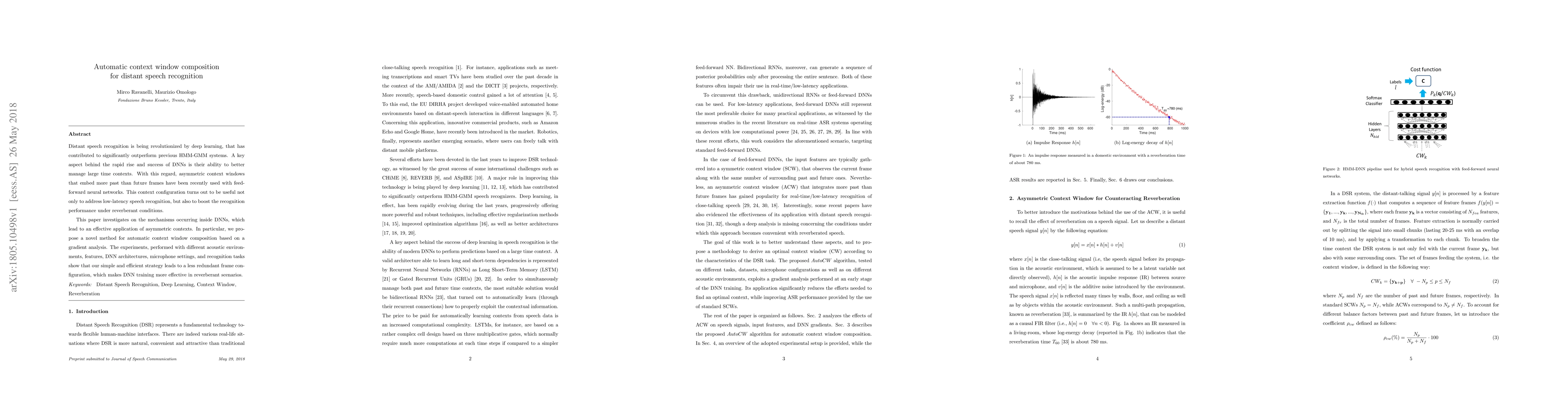 This paper proposes a novel method for automatic context window composition in deep neural networks (DNNs) for distant speech recognition, leveraging gradient analysis to optimize context windows. The method effectively reduces redundancy, enhancing DNN training efficiency and improving performance in reverberant conditions.