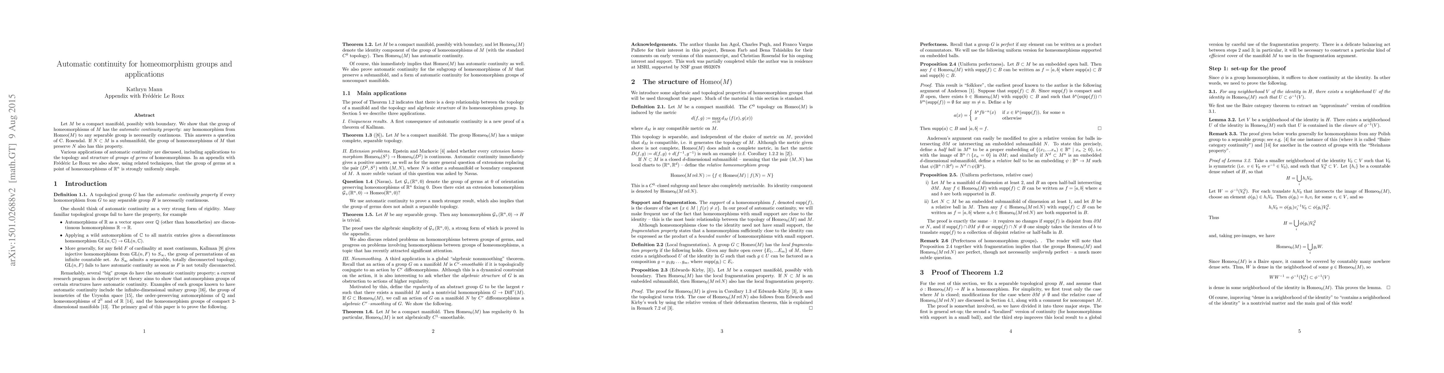 This paper demonstrates that the group of homeomorphisms of a compact manifold M, and its subgroup preserving a submanifold N, possess the automatic continuity property, meaning any homomorphism to a separable group is continuous. Applications include insights into the topology and structure of groups of germs of homeomorphisms, and an appendix proves the strong uniform simplicity of the group of germs of homeomorphisms of Rn.