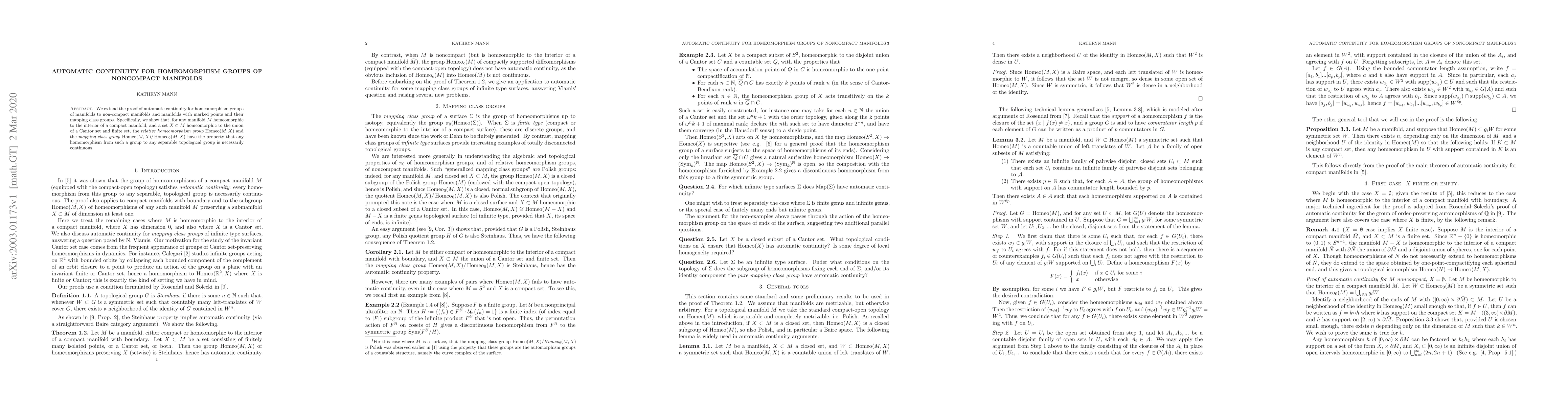 This paper proves automatic continuity for homeomorphism groups of non-compact manifolds and those with marked points, showing that any homomorphism from these groups to a separable topological group is continuous. The focus is on relative homeomorphism groups and mapping class groups of such manifolds.