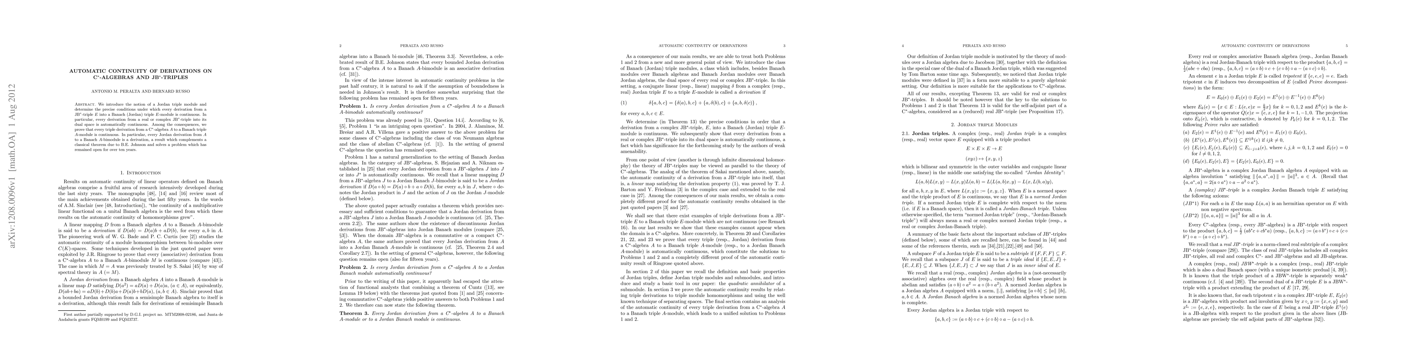 We introduce the notion of a Jordan triple module and determine the precise conditions under which every derivation from a JB*-triple E into a Banach (Jordan) triple E-module is continuous. In particular, every derivation from a real or complex JB*-triple into its dual space is automatically continuous. Among the consequences, we prove that every triple derivation from a C*-algebra A to a Banach triple A-module is continuous. In particular, every Jordan derivation from A to a Banach A-bimodule is a derivation, a result which complements a classical theorem due to B.E. Johnson and solves a problem which has remained open for over ten years.
