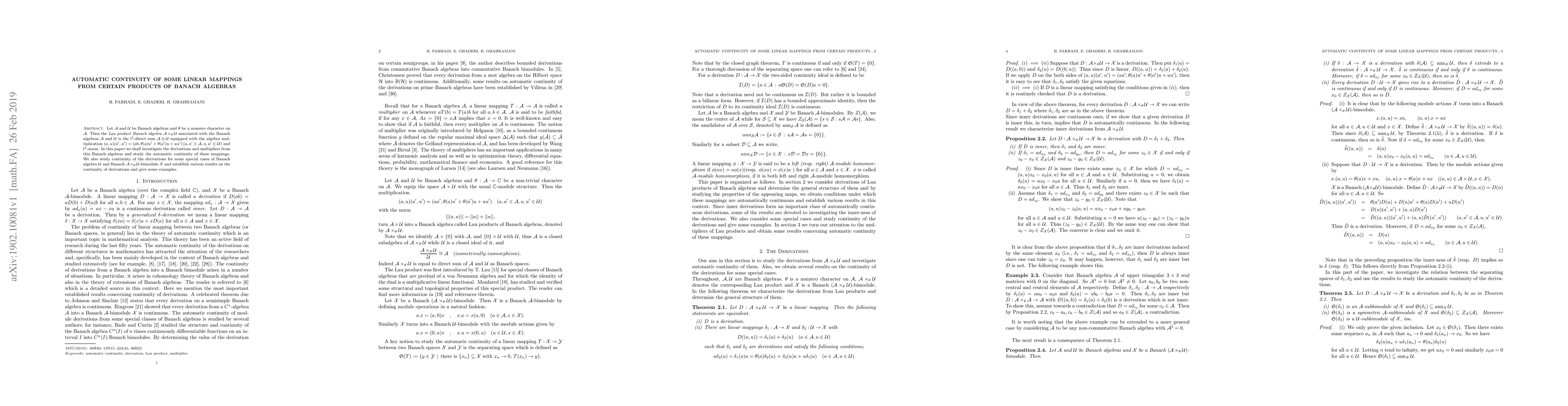 Let $\mathcal{A}$ and $\mathcal{U}$ be Banach algebras and $\theta$ be a nonzero character on $\mathcal{A}$. Then the \textit{Lau product Banach algebra} $\mathcal{A}\times_{\theta}\mathcal{U}$ associated with the Banach algebras $\mathcal{A}$ and $\mathcal{U}$ is the $l^1$-direct sum $\mathcal{A}\oplus\mathcal{U}$ equipped with the algebra multiplication $(a,u)(a',u')=(ab,\theta(a)u'+\theta(a')u+uu')\, (a,a'\in\mathcal{A},u,u'\in\mathcal{U})$ and $l^1$-norm. In this paper we shall investigate the derivations and multipliers from this Banach algebras and study the automatic continuity of these mappings. We also study continuity of the derivations for some special cases of Banach algebra $\mathcal{U}$ and Banach $\mathcal{A}\times_{\theta}\mathcal{U}$-bimodule $\mathcal{X}$ and establish various results on the continuity of derivations and give some examples.